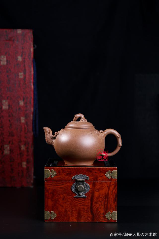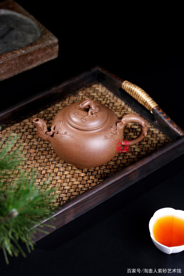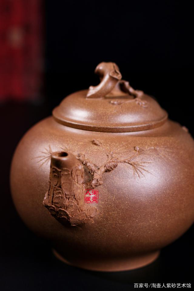 中國陶瓷藝術(shù)大師張紅華早期所製的《青梅壺》,以原礦老段泥為胎,老段泥的泥色古樸,黯黃色淡雅、古典,如同上好暖玉,觸之生溫。以蒼松、寒梅作骨,將松之蒼勁、梅之傲然融于紫砂器中,不怕冬雪壓枝的青松,代表著蒼茫人生中不被侵蝕的頑強意志,不怕寒霜凜冽的紅梅,象征著歲月長河中不愿同流的獨立精神。