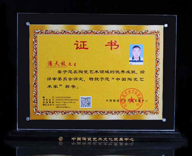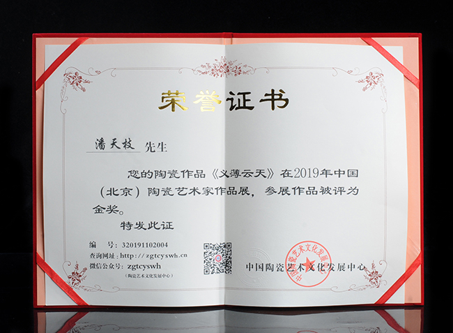 潘天枝從事陶瓷雕塑10多年,主要作品有觀音、彌勒、歷史人物,茶器等。作品多次獲得國內(nèi)各評(píng)比大賽金獎(jiǎng),2019年獲評(píng)“中國陶瓷藝術(shù)家”,作品《義薄云天》榮獲2019年中國國際(北 京)陶瓷藝術(shù)名家精品展作品評(píng)比金獎(jiǎng)等,其作品深受收藏家及有識(shí)之士青睞,廣受好評(píng)。
