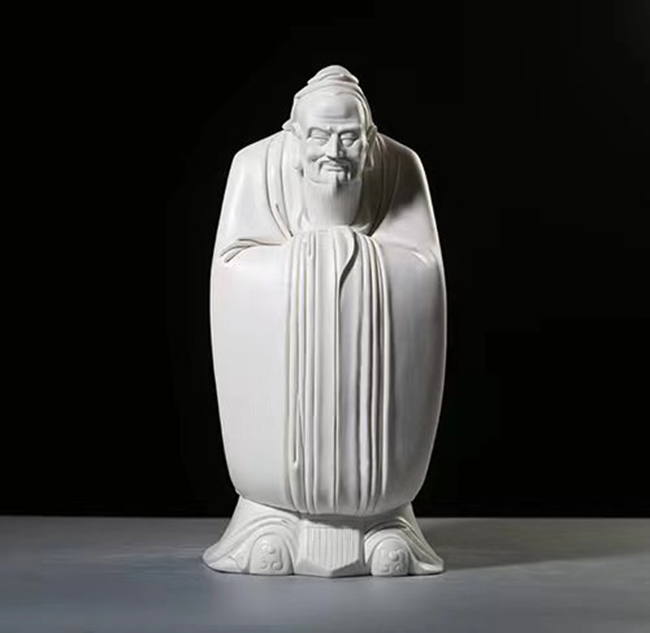 儒——《孔子》,中華文化思想的集大成者,儒家學(xué)說的創(chuàng)始人。作品主要表達了德侔天地,道貫古今的儒家精神。作品人物微傾的身軀,炯炯有神的雙眸,寬大的衣袖以儒家思想“仁義禮智信忠孝悌節(jié)恕勇讓”的篆體紋樣裝飾,給人一種追遠崇敬之情。