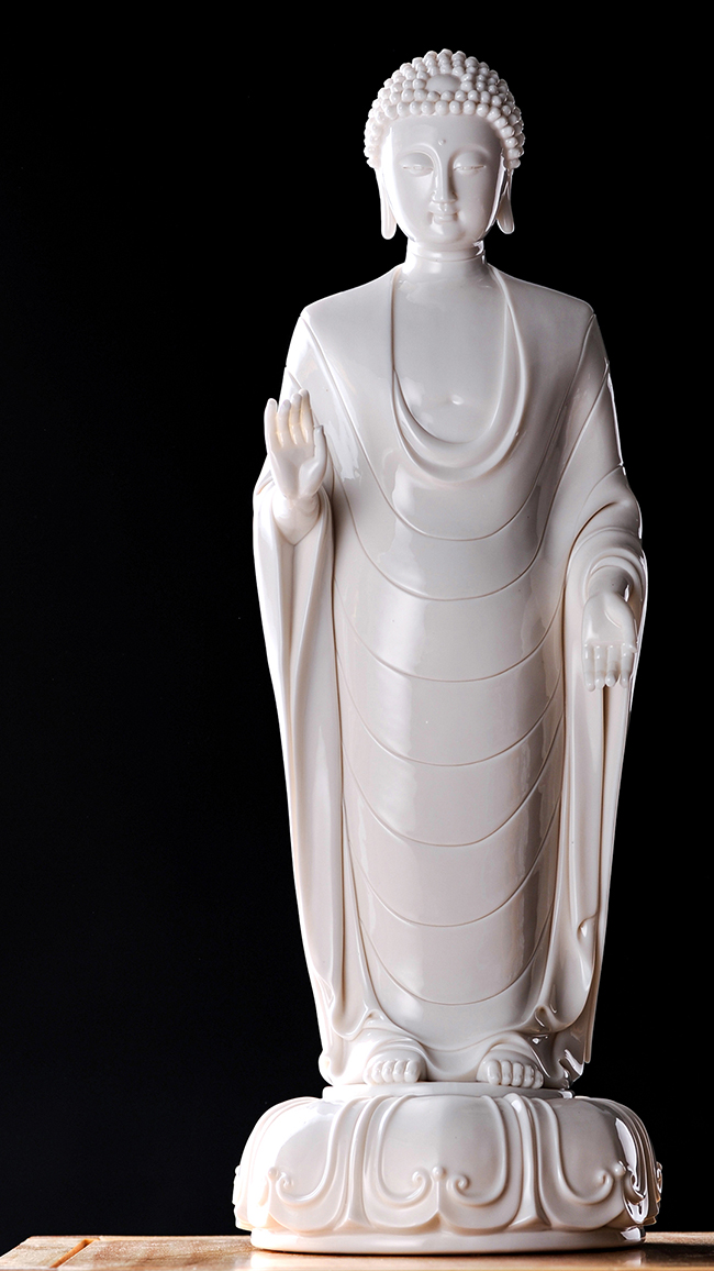 佛——《釋迦牟尼》,佛教的創(chuàng)立者及代表人物。作品著重塑造了華貴莊嚴、超凡脫俗的佛家境界。作品人物面頰豐滿,雙耳垂肩,慈悲的表情,似為蒼生祈福,站立狀的佛祖一手施“無畏印”狀,一手施“與愿印”狀,寬大的袈裟袖袍之上鐫刻了梵文《金剛經(jīng)》,帶給眾生心安和無畏。