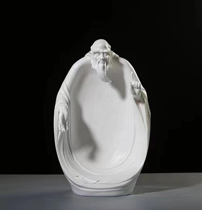 道——《老子》,道家?guī)熥妗W髌分卦趥鬟_一種脫塵出俗、仙風(fēng)道骨、遨游“無為”之境的道家氣韻。作品中蒼老而矍鑠的面部有一種感人的藝術(shù)力量,左手拇指和食指貼身上指,其余三指彎曲,右手攥著一卷竹簡,暗示“道生一,一生二,二生三,三生萬物”的思想哲理。作者巧妙地將道家“道法自然無為而治”的思想精髓,利用篆體變成一種紋飾刻畫在袖口之處。