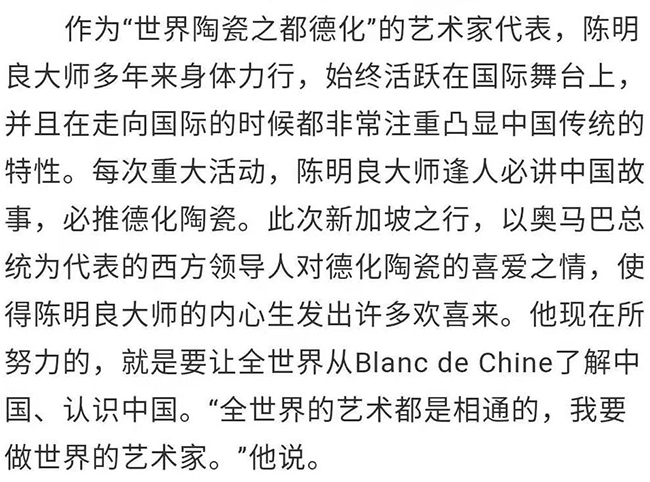 中國工藝美術(shù)大師、中國陶瓷藝術(shù)大師、國家非遺“德化瓷燒制技藝”代表性傳承人陳明良作為藝術(shù)界的杰出代表受邀出席了本次峰會(huì),并上臺(tái)做了主題發(fā)言。