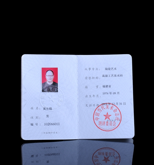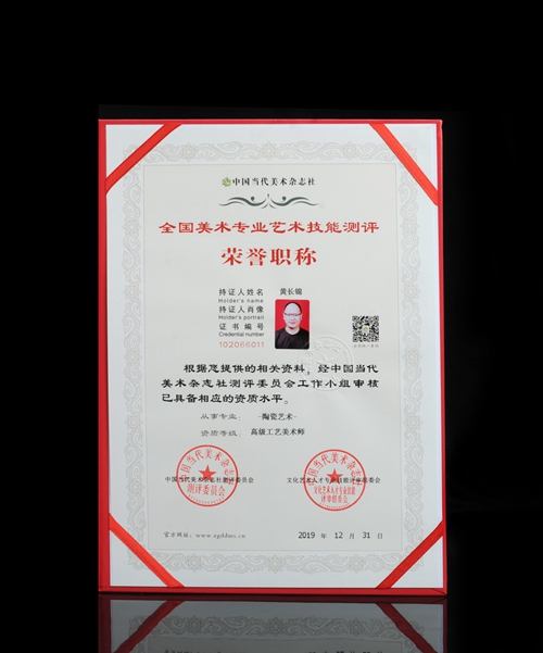近日,陶瓷藝術家黃長錦,通過了中國當代美術專業(yè)藝術測評委員會評測,榮獲“高級工藝美術師”。