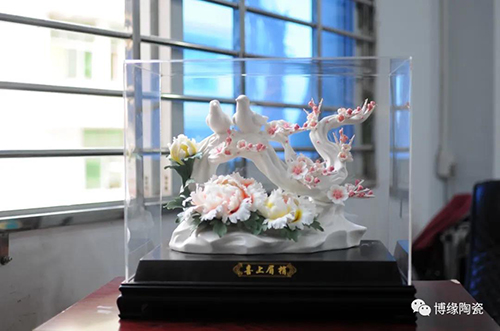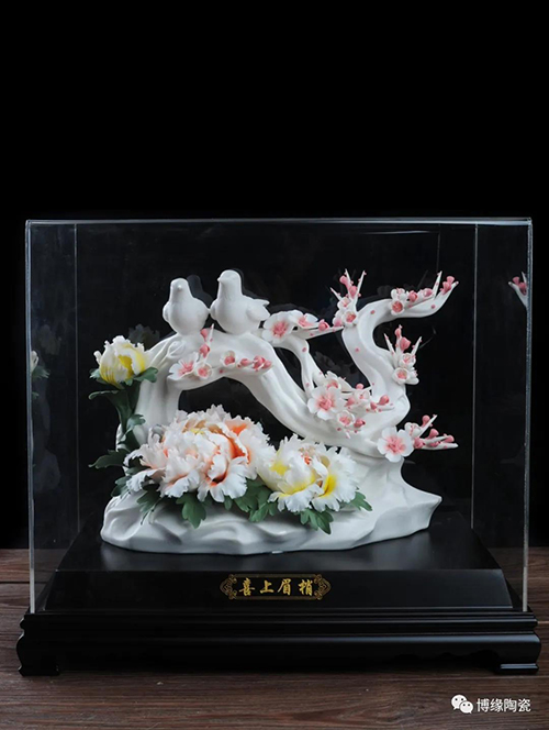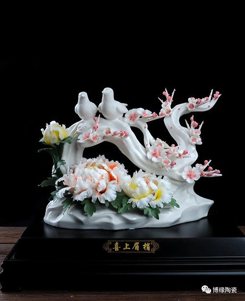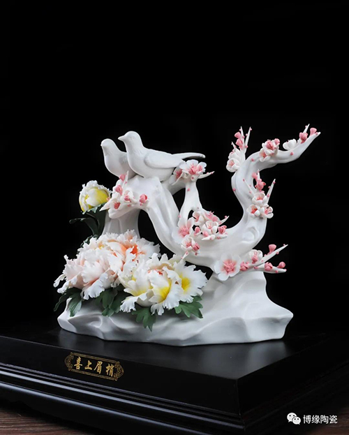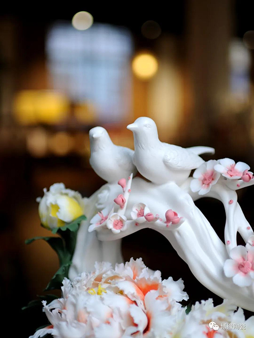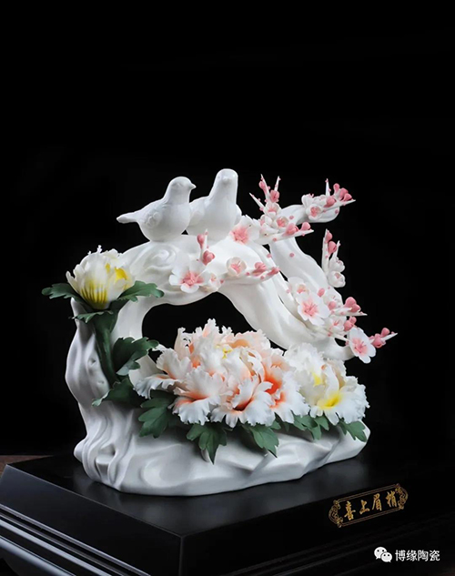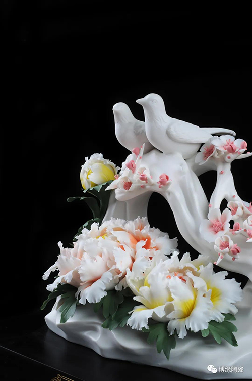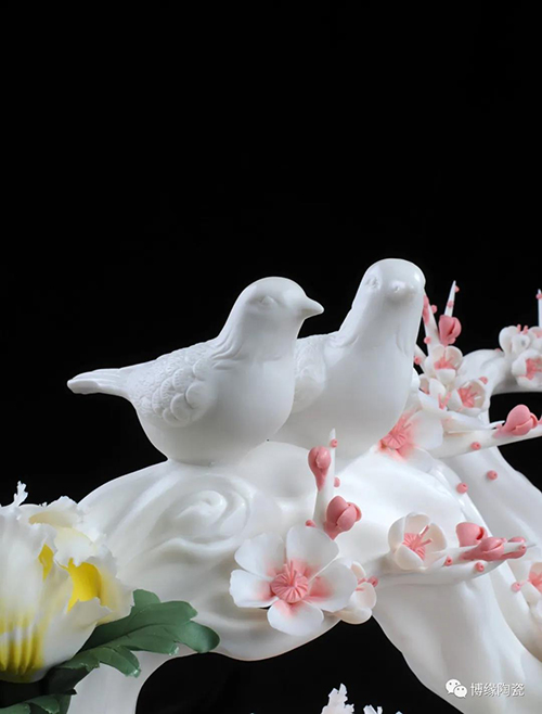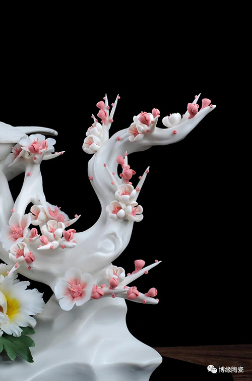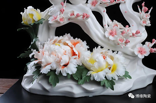 作品沿用德化傳統(tǒng)的制瓷技法“捏、塑、雕、鏤、貼、接、推、修,作品集合喜鵲、牡丹、梅花等盡顯出喜慶的景象,瓷花純手工捏制,細膩精致、以假亂真。體現(xiàn)出創(chuàng)作者匠心獨具。