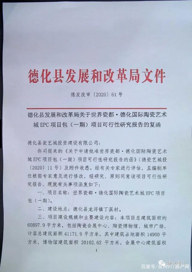 4月29日,德化縣政府官網(wǎng)信息公開欄發(fā)布了《德化縣瓷藝城投資建設(shè)有限公司關(guān)于德化國際陶瓷藝術(shù)城EPC項(xiàng)目包(一期)項(xiàng)目可行性研究報(bào)告的復(fù)函》(以下簡稱《復(fù)函》),文號為“德發(fā)改審〔2020〕61號”。
