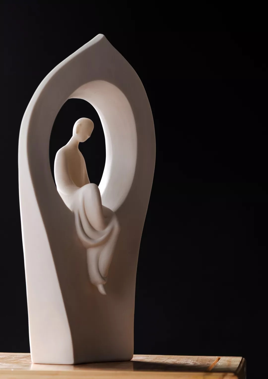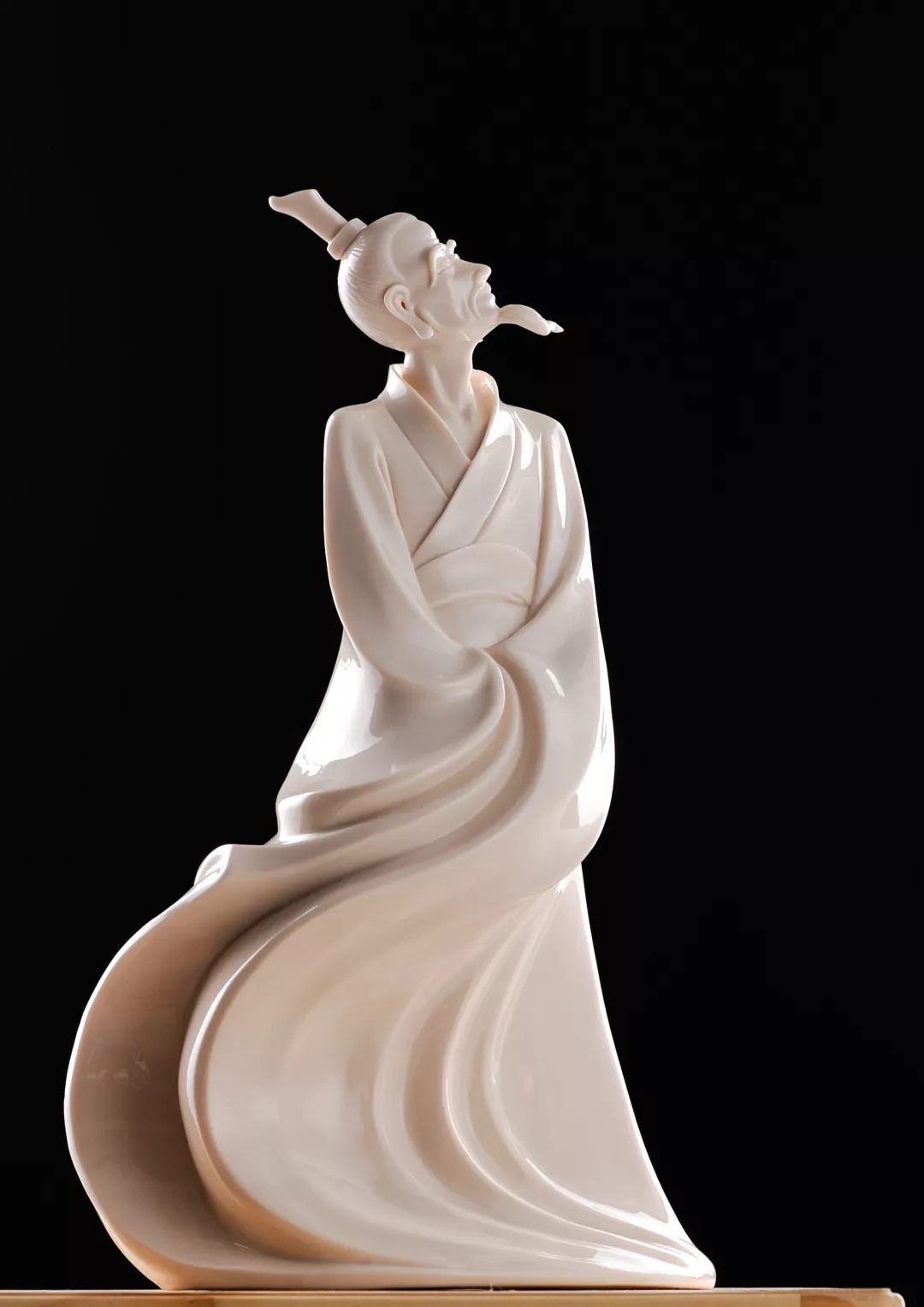 在所有題材創(chuàng)作中,陳建陽偏愛人物題材創(chuàng)作,在人物塑造方面積累了大量的經(jīng)驗,無論是觀音、羅漢、彌勒、達摩,還是古典仕女、傳統(tǒng)人物等,造型簡練大方、線條清晰流暢,人物體態(tài)自然、面部表情舒緩,再加以白瓷素凈典雅的特性,使陳建陽的人物雕塑更顯雅致。為了更好地塑造人物雕塑特點,他博覽群書、研究史料,尊重傳統(tǒng)人物造像特點,于傳統(tǒng)經(jīng)典中總結(jié)人物個性,又包含了當下人們對于中華優(yōu)秀傳統(tǒng)文化的認知,將中華優(yōu)秀傳統(tǒng)精神濃縮在人物身上。
