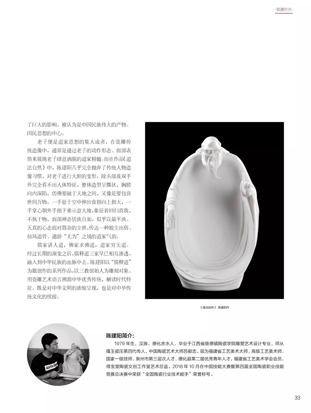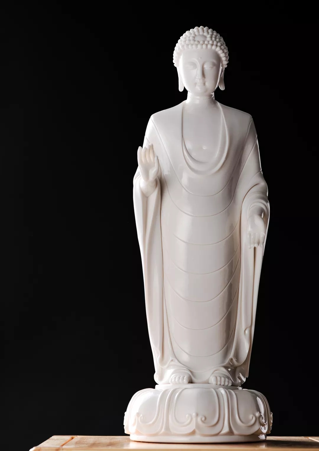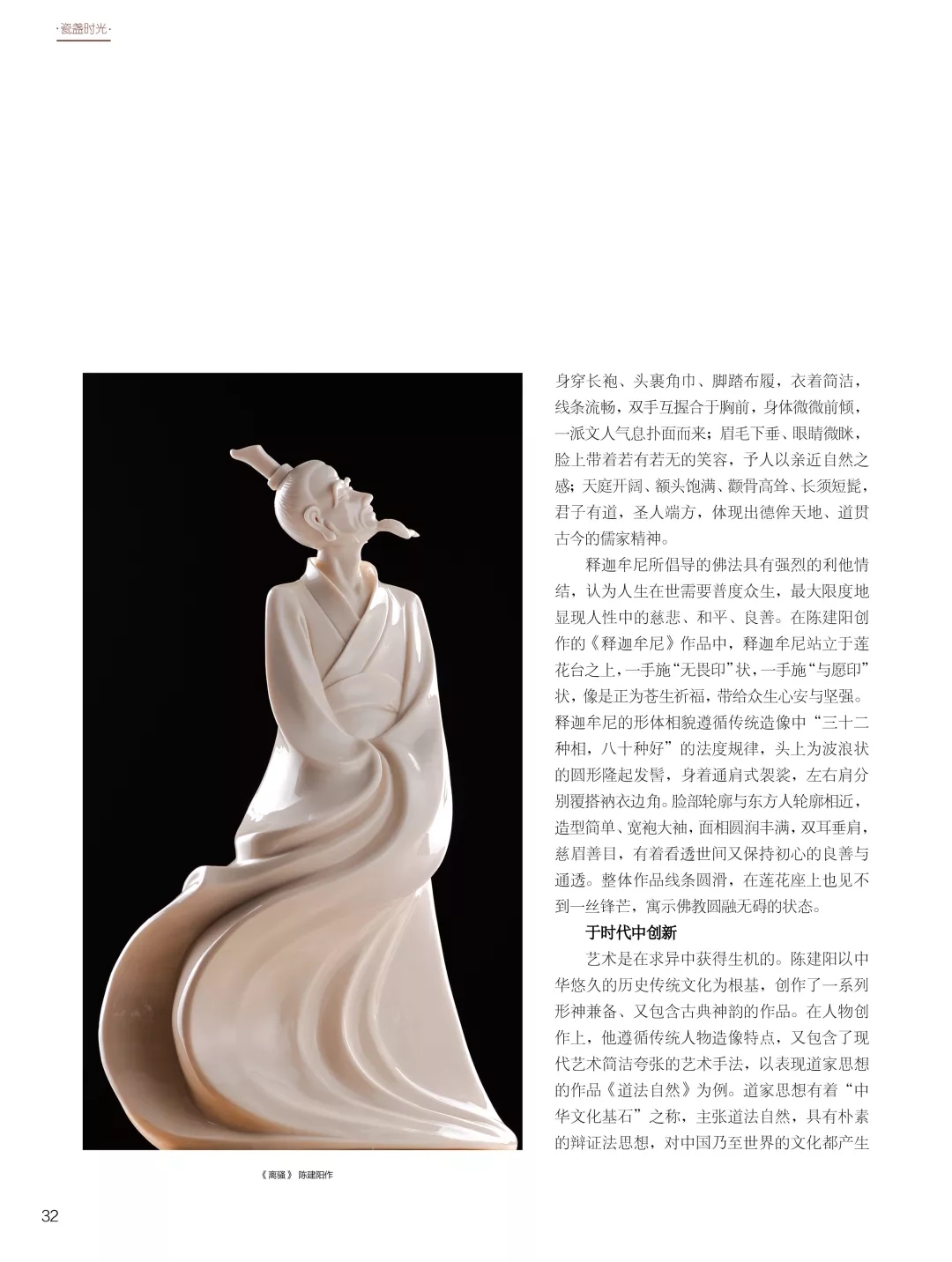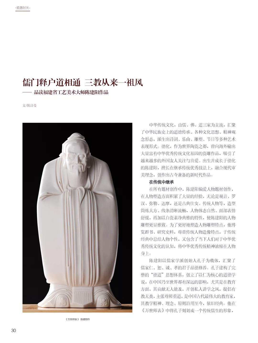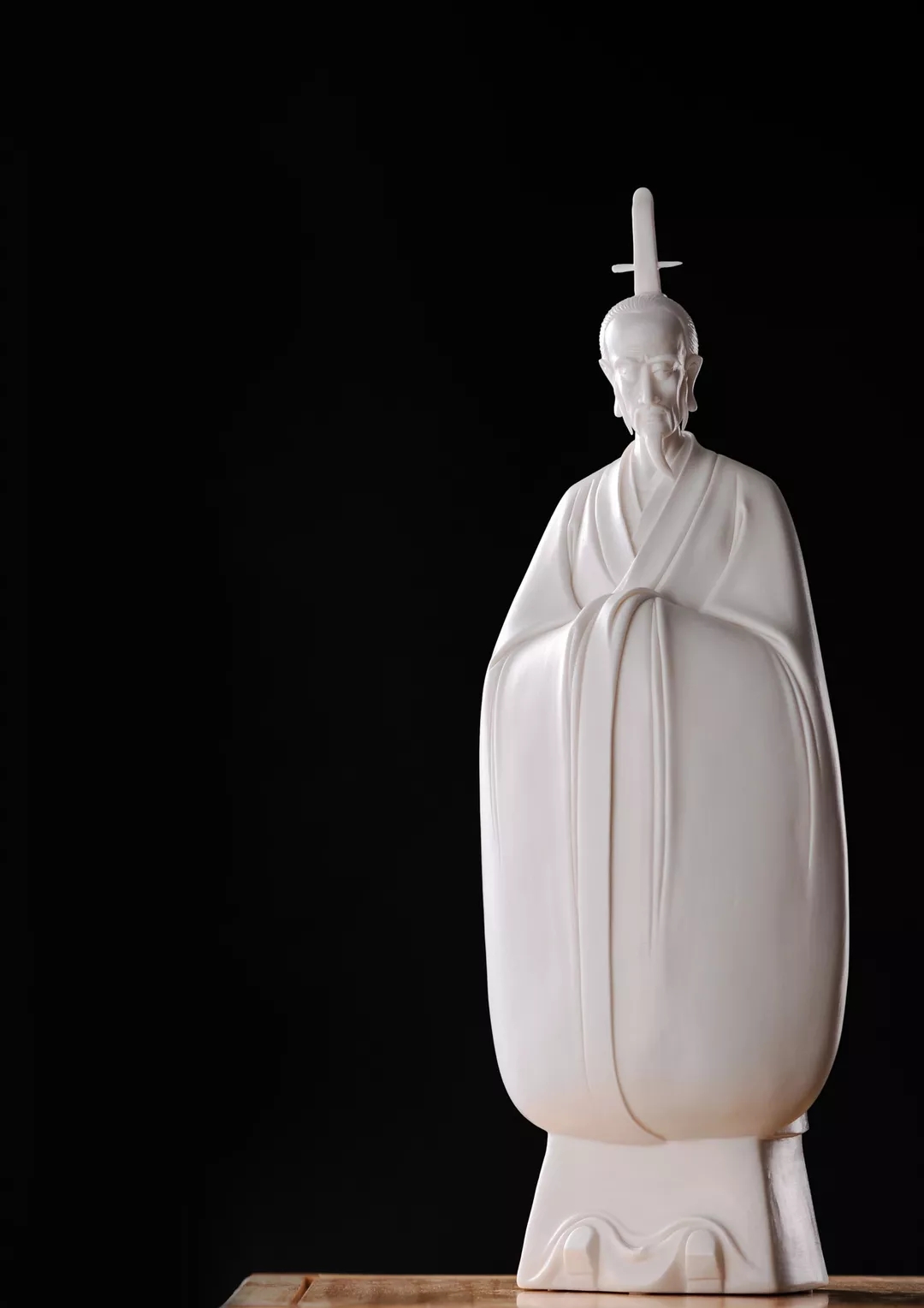 中華傳統(tǒng)文化,由儒、佛、道三家為主流,匯聚了中華民族史上的道德傳承、各種文化思想、精神觀念形態(tài),派生出詩詞、樂曲、雕塑、節(jié)日等多種藝術(shù)表現(xiàn)形式。德化,作為世界陶瓷之都,曾向海外輸出大量富有中華優(yōu)秀傳統(tǒng)文化基因的瓷雕作品,吸引了越來越多的外國友人關(guān)注與喜愛。出生并成長于德化的陳建陽,擅長在繼承傳統(tǒng)優(yōu)秀技法上,融合現(xiàn)代審美理念,創(chuàng)作出古今兼?zhèn)涞男聲r代作品。