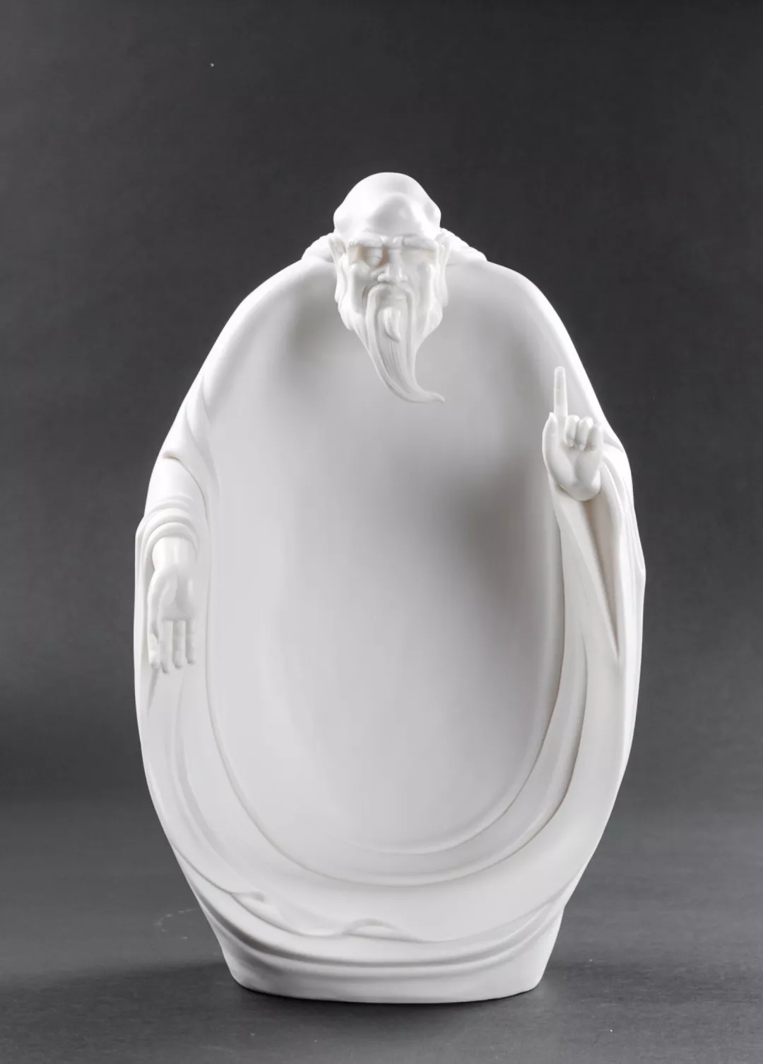 老子便是道家思想的集大成者,在瓷雕傳統(tǒng)造像中,通常是通過老子的動作形態(tài)、面部表情來展現(xiàn)老子肆意灑脫的道家精髓。而在作品《道法自然》中,陳建陽幾乎完全拋棄了傳統(tǒng)人物造像習慣,對老子進行大膽的變形,除頭部及雙手外完全看不出人體特征,整體造型呈瓢狀,胸膛向內(nèi)深陷,仿佛要融于天地之間,又像是要包容世間萬物,一手懸于空中伸出食指向上指天,一手掌心朝外手指下垂示意大地,象征著回歸真我,不執(zhí)于物,面部神態(tài)恬淡自如,似乎以最平淡、天真的心態(tài)面對囂雜的塵世,傳達一種脫塵出俗、仙風道骨、遨游“無為”之境的道家氣韻。
