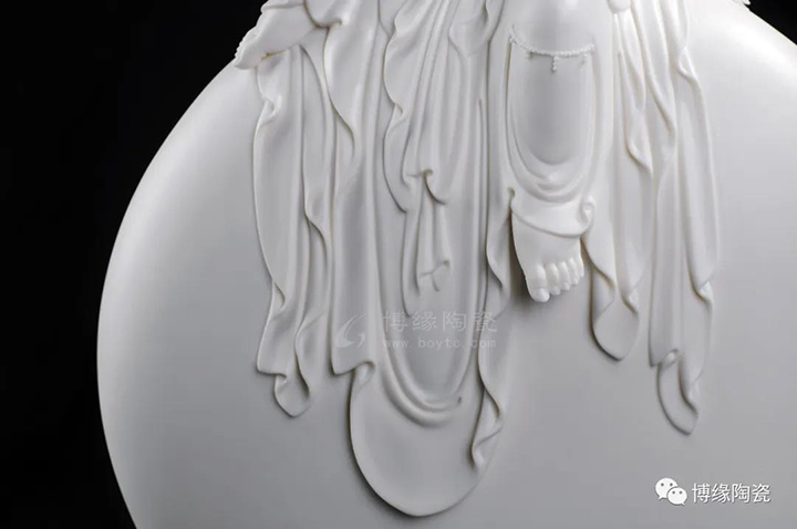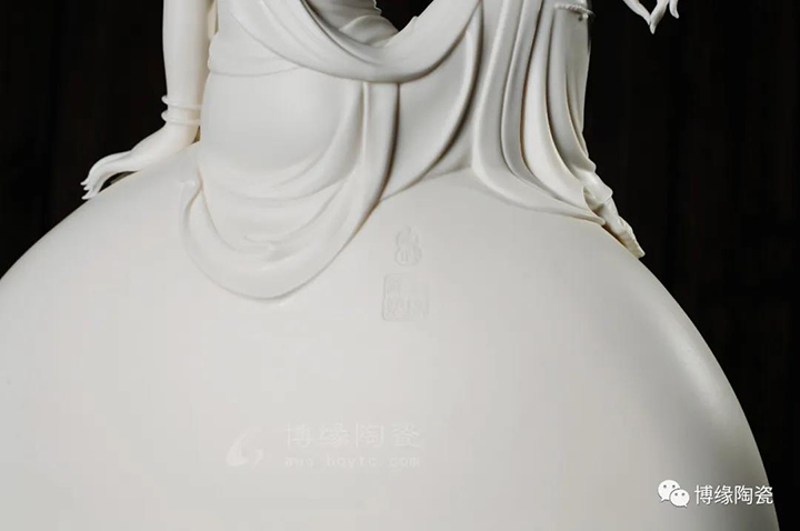 早在明代德化白瓷佛像就名聲在外,一代“瓷圣”何朝宗佛像名作流傳后世,成為世界各大博物館收藏的珍品,更對(duì)佛像雕塑史上產(chǎn)生深遠(yuǎn)的影響,形成“何派”雕塑,其開創(chuàng)的捏、塑、雕、刻、刮、削、接、貼八字技法延用至今。何派觀音雕塑注重于細(xì)節(jié)之美,精益求精,故而十分著意衣紋的刻畫,使線條流暢,翻轉(zhuǎn)自然。觀其佛像,仿佛有春風(fēng)拂面,衣袂飄揚(yáng)的出塵之感。