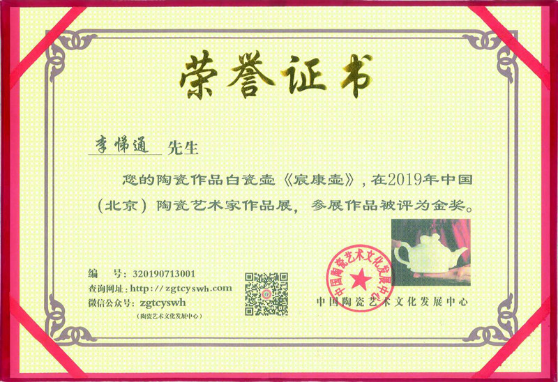 2019年,陶瓷作品《宸康壺》榮獲中國(guó)(北京)陶瓷藝術(shù)家作品展金獎(jiǎng);