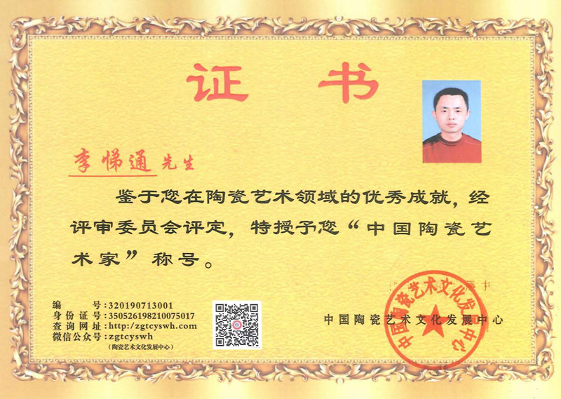 2019年,獲中國(guó)陶瓷藝術(shù)家稱號(hào)。