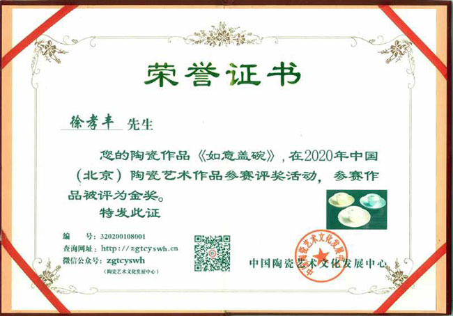 近日,由中國陶瓷藝術(shù)名家徐孝豐創(chuàng)作的《如意蓋碗》獲2020年中國(北京)陶瓷藝術(shù)作品展金獎,此前《祥福蓋碗》等三件作品獲2019年中國(北京)陶瓷藝術(shù)家作品展金獎,在2018年底徐孝豐創(chuàng)作的《樂禪杯》、《吉祥杯(玉黃)》、《西施壺》榮獲2018年中國(北京)陶瓷藝術(shù)家作品展金獎。