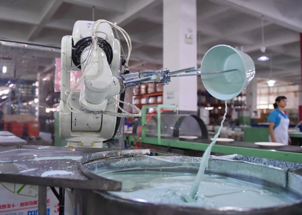 2019年10月11日,在位于德化縣的一公司生產(chǎn)車間,自動化上釉“機(jī)械臂”進(jìn)行上釉工序。(記者林善傳 攝)