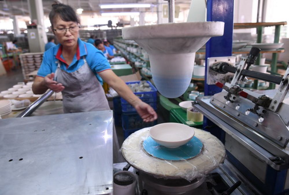 2019年10月11日,在位于德化縣的一公司生產(chǎn)車間,工人在印花機(jī)臺上進(jìn)行產(chǎn)品印花工序操作。(記者林善傳 攝)
