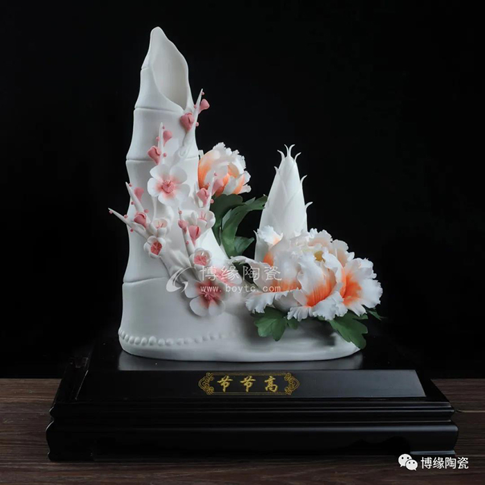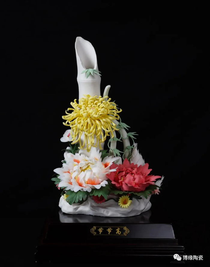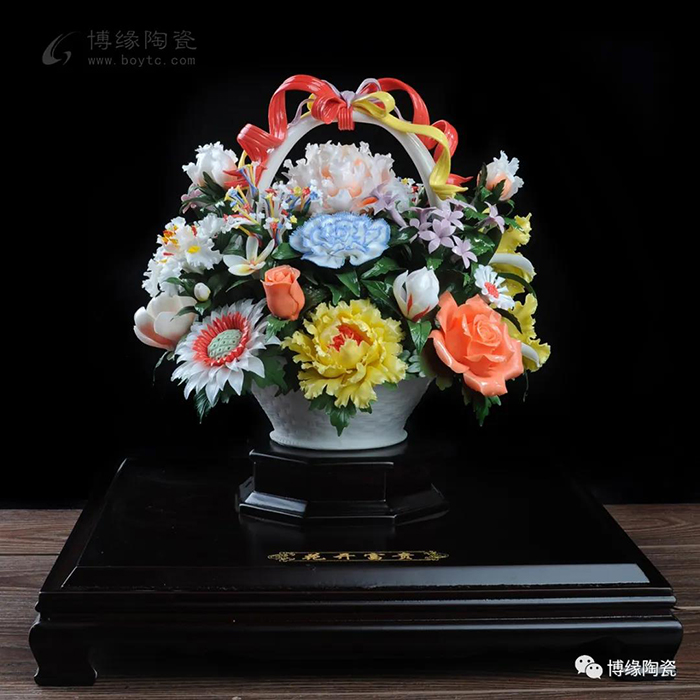 瓷花受到工藝的制約,單純的花卉造型過于簡單,沒有文化內(nèi)涵,瓷花作品通常與花籃的籃形、掛盤、瓶類,假山,如玉、竹筍其他植物等其它器物造型結(jié)合,來表現(xiàn)一個(gè)主題。