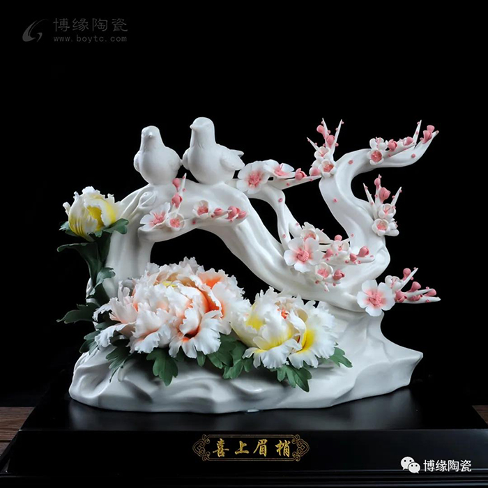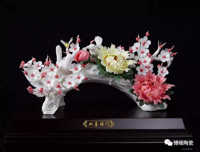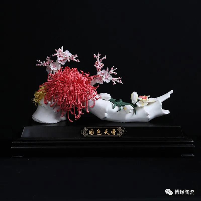瓷花與底座的搭配,突出了瓷花的主題,同時(shí)賦予瓷花更高的文化內(nèi)涵。隨著時(shí)代的進(jìn)步和創(chuàng)新,人們的審美觀不斷變化,瓷花藝人們在繼承傳統(tǒng)的基礎(chǔ)上,通過不同創(chuàng)作手法,使瓷花的表現(xiàn)形式更為多樣。