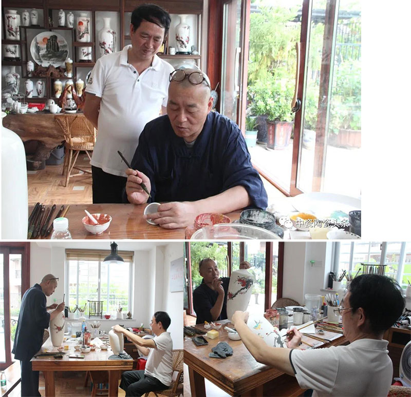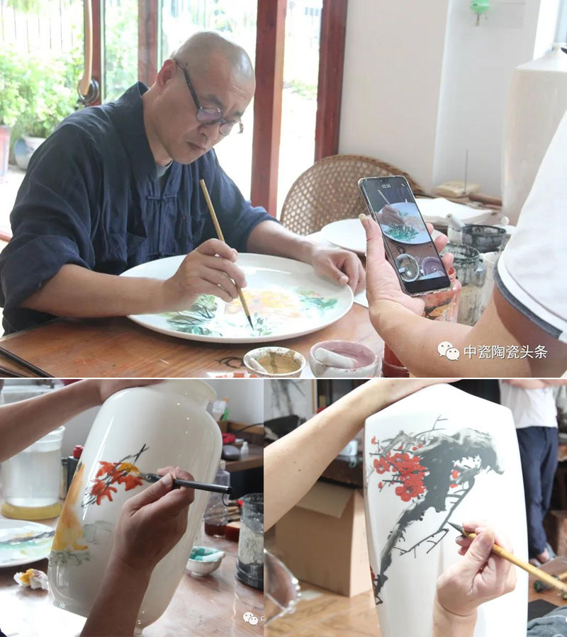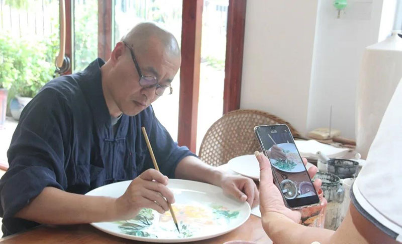 7月24日下午,在德化縣戴云人家陶瓷裝飾畫社里,禪畫大師釋延年法師與福建省工藝美術大師陳行一的瓷繪交流創(chuàng)作悄然進行。他們以瓷為紙,釉彩為墨,在交流碰撞中勾勒出瓷上芳華。