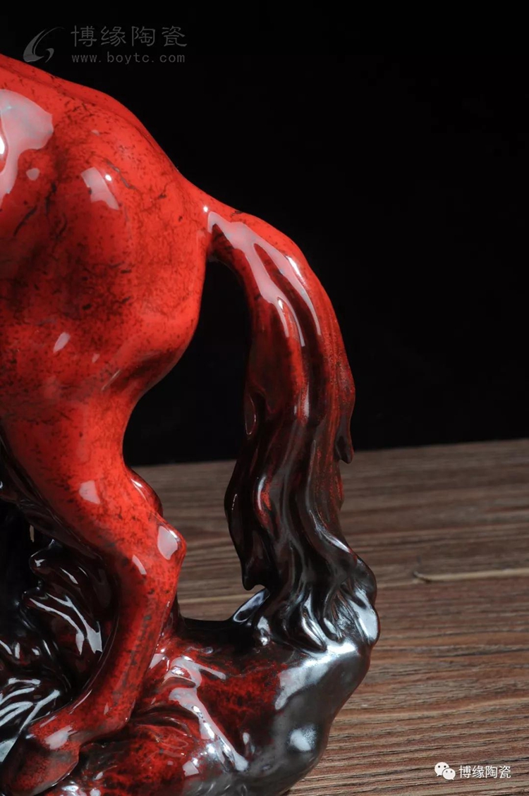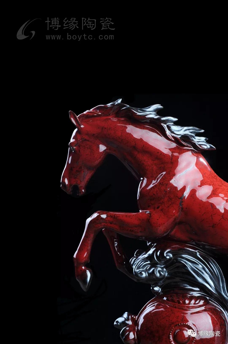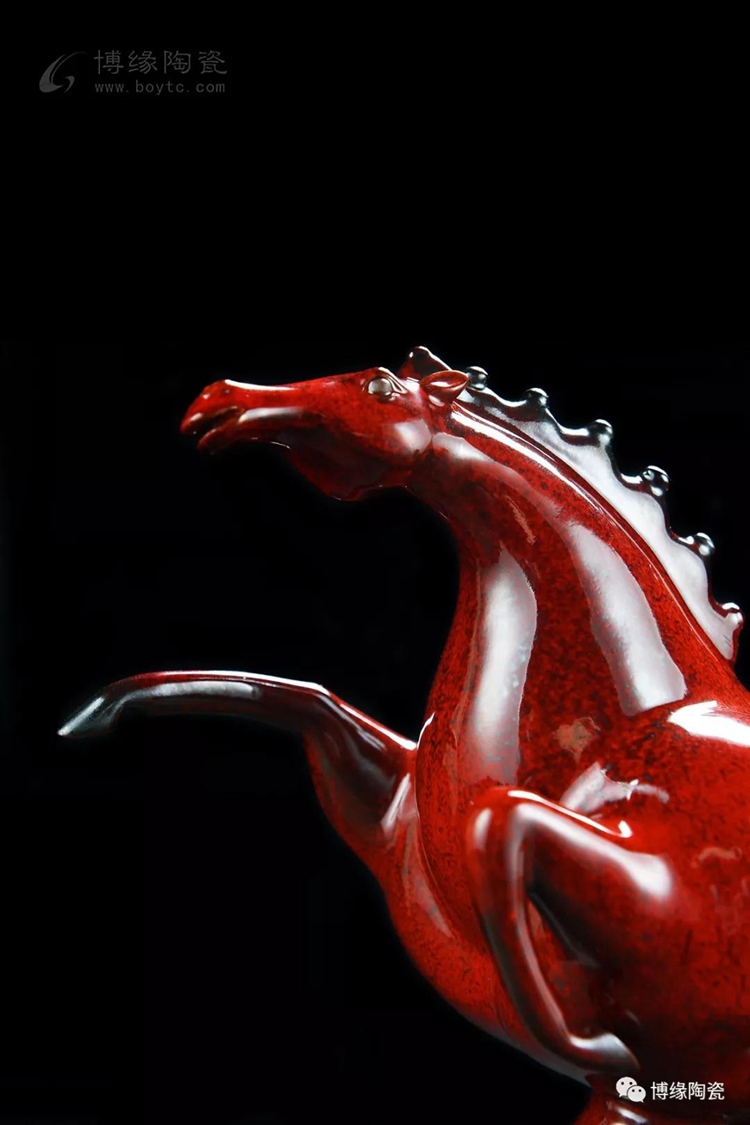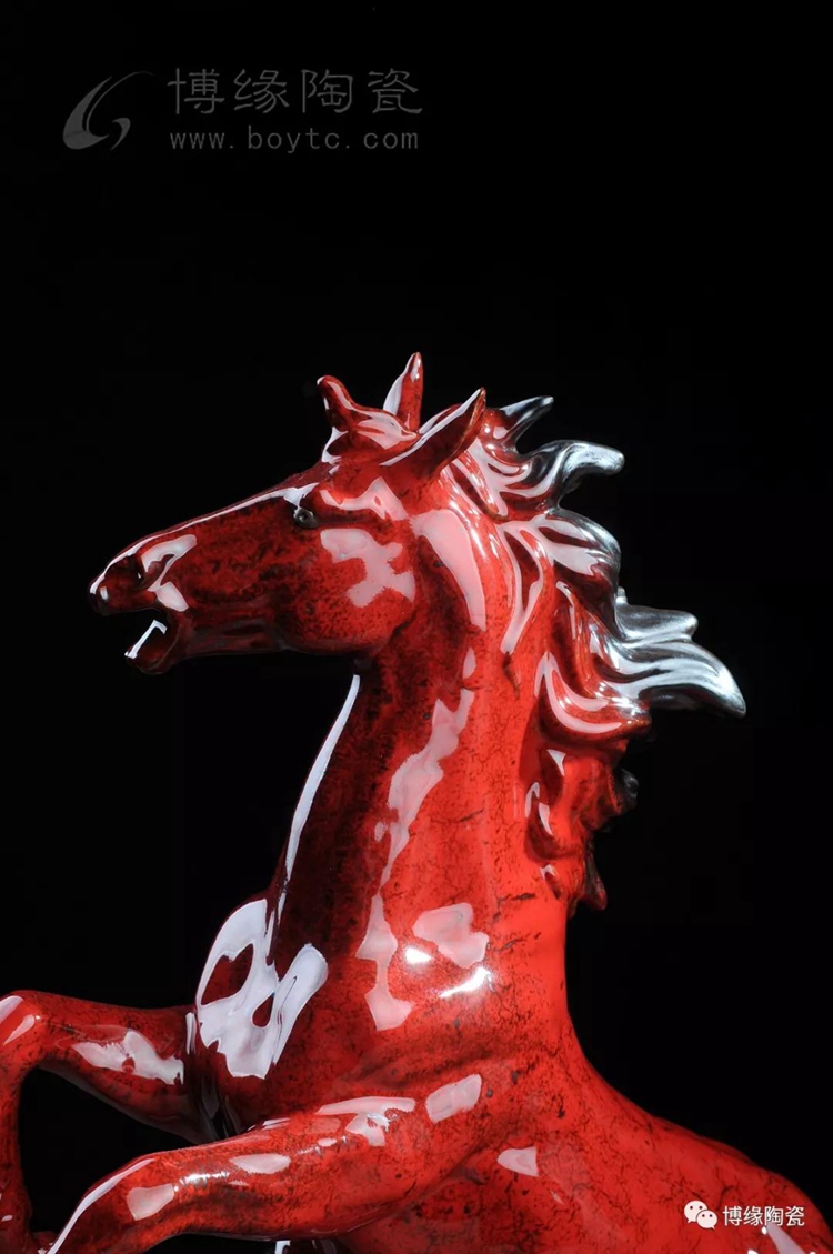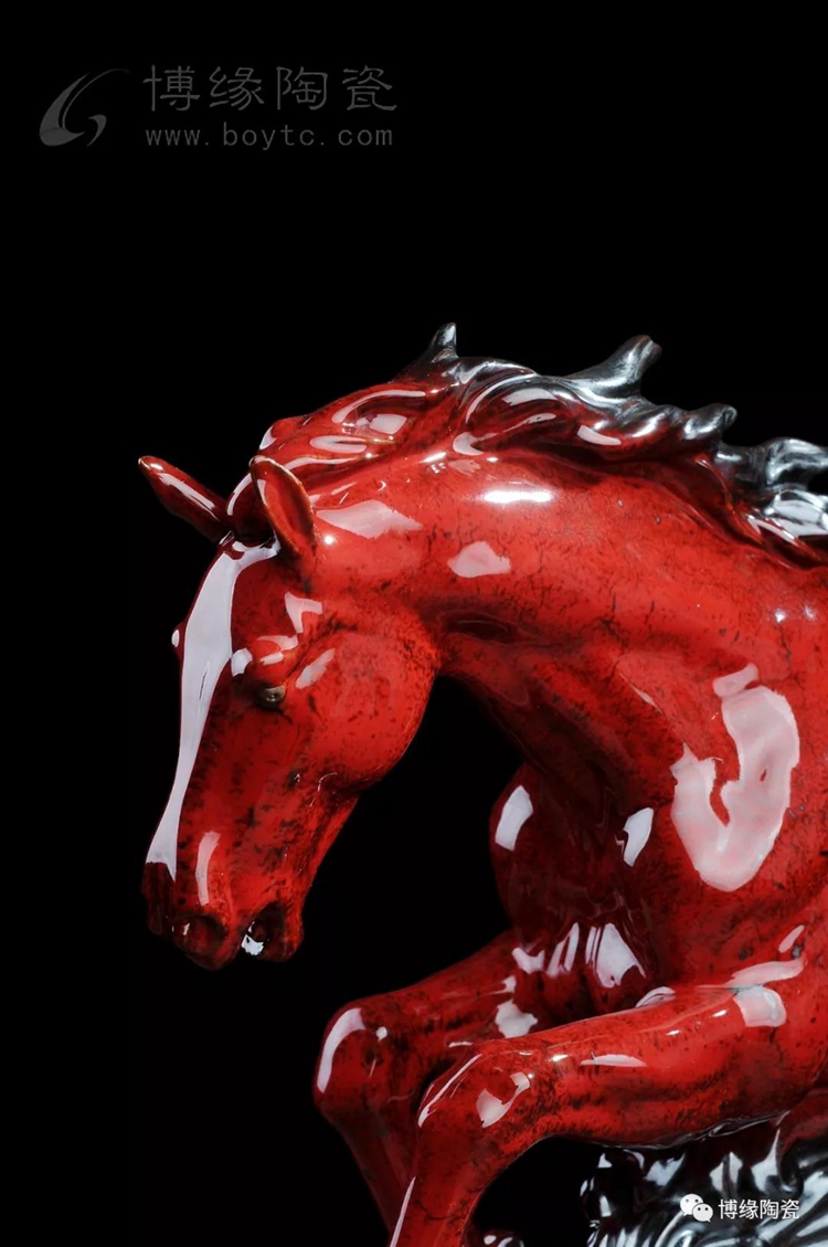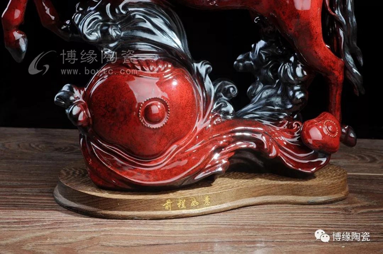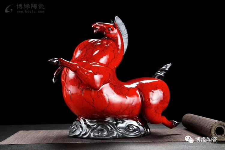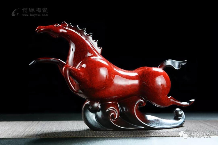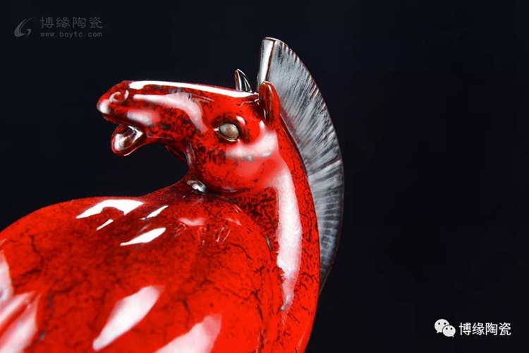 《前程如意》、《唐馬》、《立馬成功》、《馬踏飛燕》、《踏浪天馬》作品采用烈焰紅釉經(jīng)1300多度高溫?zé),產(chǎn)生窯變效果,釉面鮮艷、喜慶。所塑駿馬精神抖擻,身強(qiáng)力壯,有的兩只前蹄騰空躍起,威風(fēng)凜凜,鬃毛隨風(fēng)擺動(dòng),極富動(dòng)感。在皮膚下面, 是熱血奔涌的血管,進(jìn)而是塊狀的肌肉與健壯的骨架,馬的蹄、鬢毛、眼神、耳朵、乃至鼻息,都傳遞出 濃烈的信息,具有很強(qiáng)的藝術(shù)感染力。