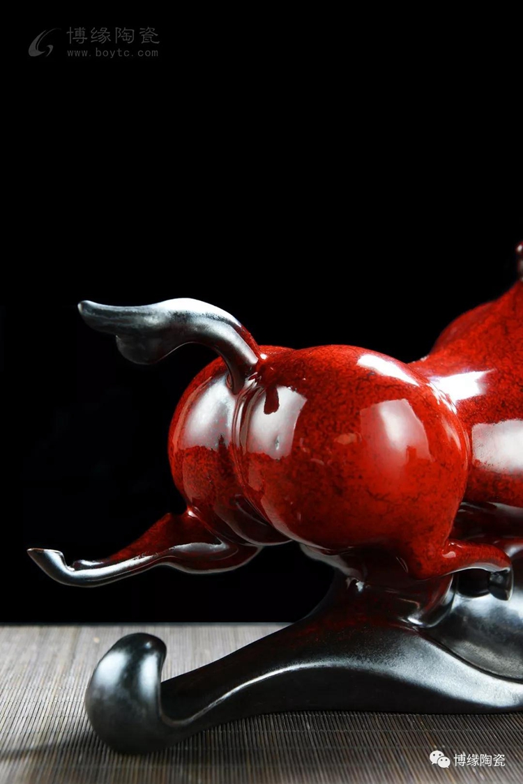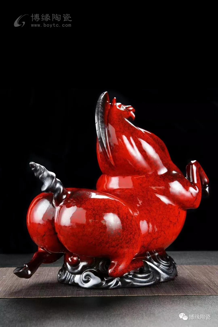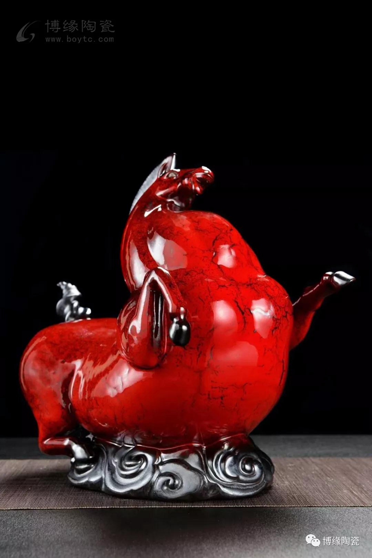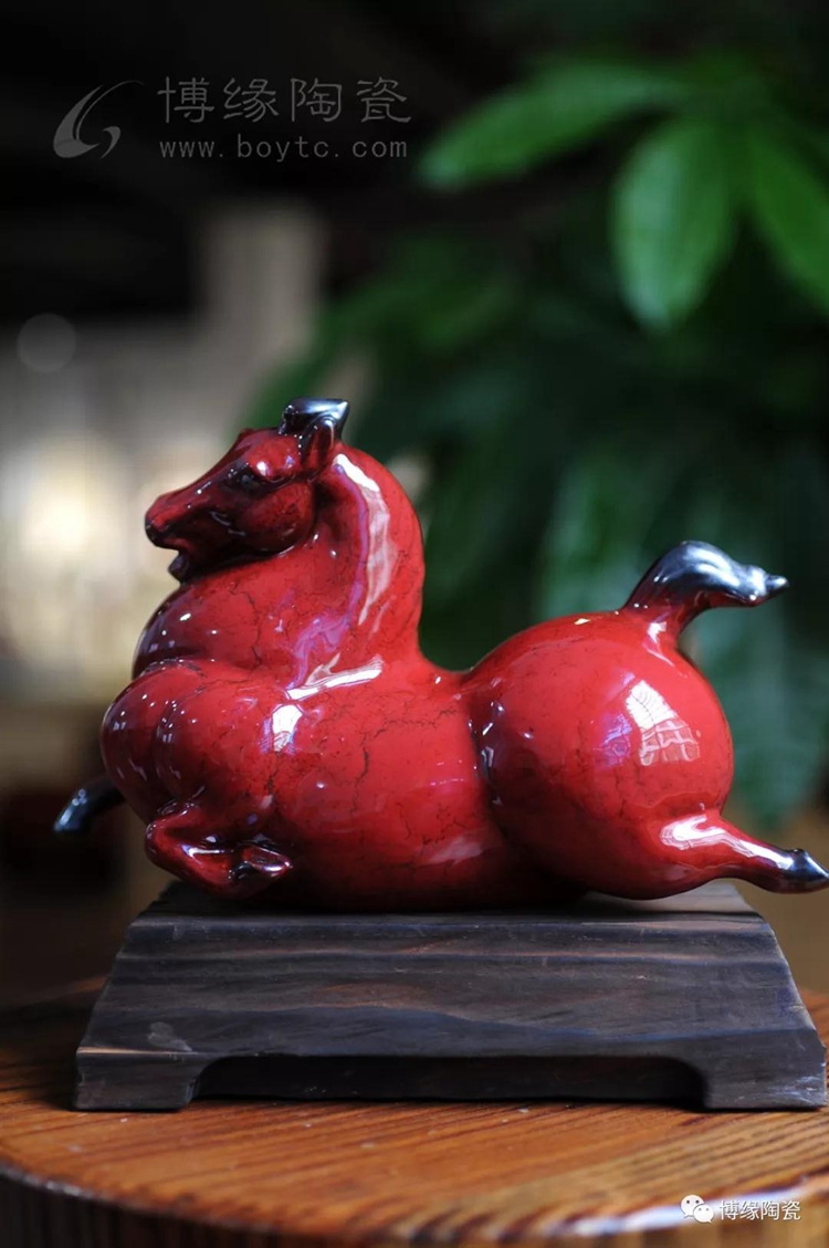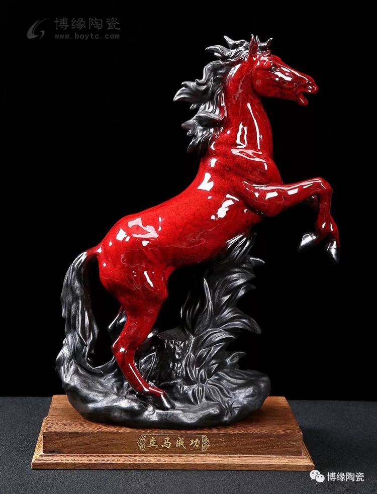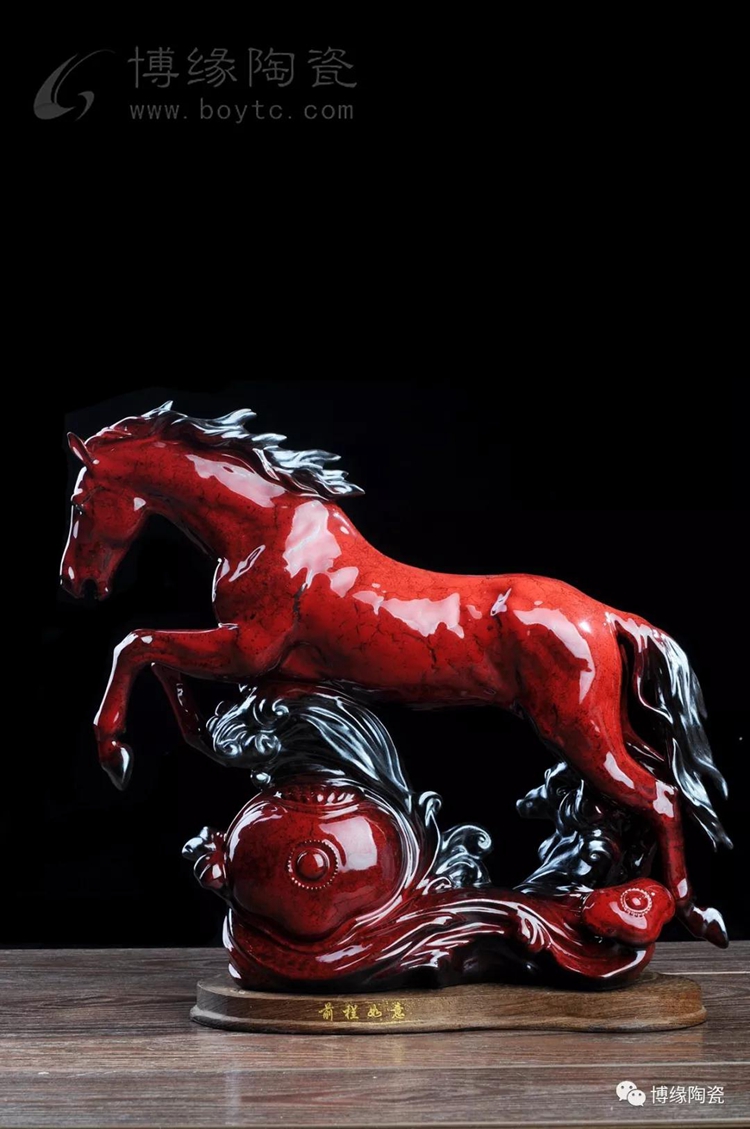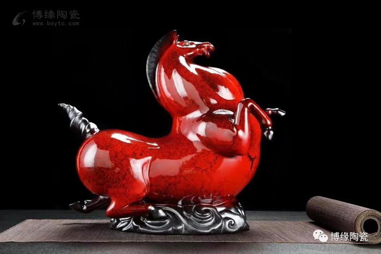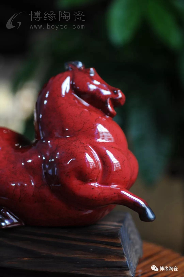 《前程如意》、《唐馬》、《立馬成功》、《馬踏飛燕》、《踏浪天馬》作品采用烈焰紅釉經(jīng)1300多度高溫?zé),產(chǎn)生窯變效果,釉面鮮艷、喜慶。所塑駿馬精神抖擻,身強(qiáng)力壯,有的兩只前蹄騰空躍起,威風(fēng)凜凜,鬃毛隨風(fēng)擺動(dòng),極富動(dòng)感。在皮膚下面, 是熱血奔涌的血管,進(jìn)而是塊狀的肌肉與健壯的骨架,馬的蹄、鬢毛、眼神、耳朵、乃至鼻息,都傳遞出 濃烈的信息,具有很強(qiáng)的藝術(shù)感染力。
