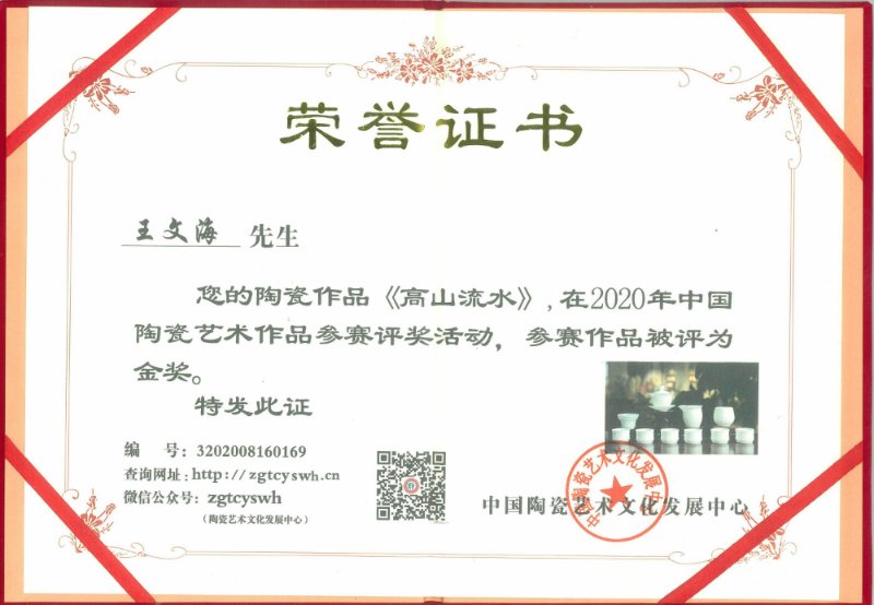 王文海經(jīng)過多年配方研究,成功配方出珞月翡玉瓷,其是當(dāng)今高端白瓷上品,瓷質(zhì)地、光澤近似 翡玉,珞月翡玉瓷需精選上好高嶺土,其每噸原泥料高達(dá)50000多元,經(jīng)過70多道工序制作,并且其 瓷需經(jīng)過1350多度高溫?zé)疲少|(zhì)白、潤、透,是不可多得的上品。