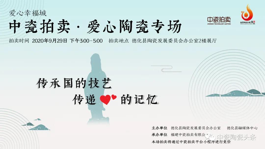 大國有匠,大愛無形。中瓷拍賣·愛心陶瓷拍賣專場即將在9月29日開拍,并將拍賣所得捐給“愛心幸福城”基金,積極為德化“愛心幸福城”的創(chuàng)建貢獻一份力量。