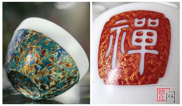 所有技術(shù)問題都只能靠自己摸索。他一遍又一遍地回看紀(jì)錄片,從視頻里學(xué)習(xí)犀皮漆工藝,也特意去請(qǐng)教了甘而可大師。功夫不負(fù)有心人。歷時(shí)將近半年,終于成功將凝脂似雪的玉瓷茶杯與古樸典雅的大漆融為一體,創(chuàng)作出第一個(gè)富有德化本土特色的瓷胎漆器茶杯作品。“當(dāng)時(shí)遇到最大的問題是大漆很難附著在溫潤(rùn)細(xì)膩的玉瓷表面上,經(jīng)常在打磨的過程中,或遇熱的時(shí)候就脫落了。”徐華文回憶道。