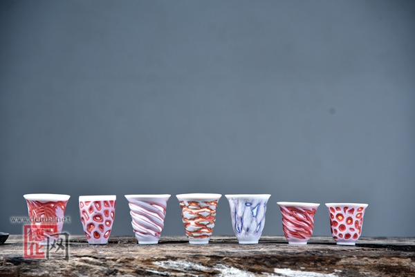 與傳統(tǒng)絞胎工藝不同的是,徐華文的玉瓷絞胎杯不是將色泥擰在一起,制成新的泥料,然后拉坯成型,或切成片狀作鑲嵌使用,而是別具匠心的將色泥一層層的疊加到茶杯的坯體上,然后再經(jīng)過圖案雕刻,讓顏色一層層的顯露出來,新穎別致,極富藝術(shù)創(chuàng)新價(jià)值。