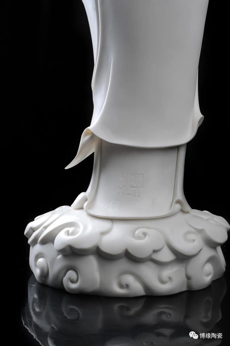 早在明代德化白瓷佛像就名聲在外,一代“瓷圣”何朝宗佛像名作流傳后世,成為世界各大博物館收藏的珍品,更對(duì)佛像雕塑史上產(chǎn)生深遠(yuǎn)的影響,形成“何派”雕塑,其開(kāi)創(chuàng)的捏、塑、雕、刻、刮、削、接、貼八字技法延用至今。何派觀音雕塑注重于細(xì)節(jié)之美,精益求精,故而十分著意衣紋的刻畫(huà),使線條流暢,翻轉(zhuǎn)自然。觀其佛像,仿佛有春風(fēng)拂面,衣袂飄揚(yáng)的出塵之感。