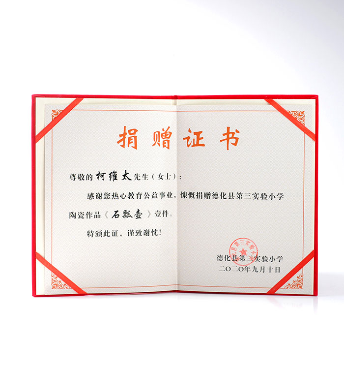 由德化縣教育局楊光照副局長為中國青年陶瓷藝術(shù)家柯維太頒發(fā)《捐贈(zèng)證書》。