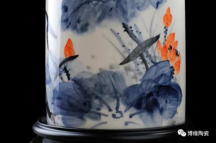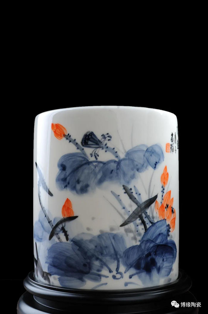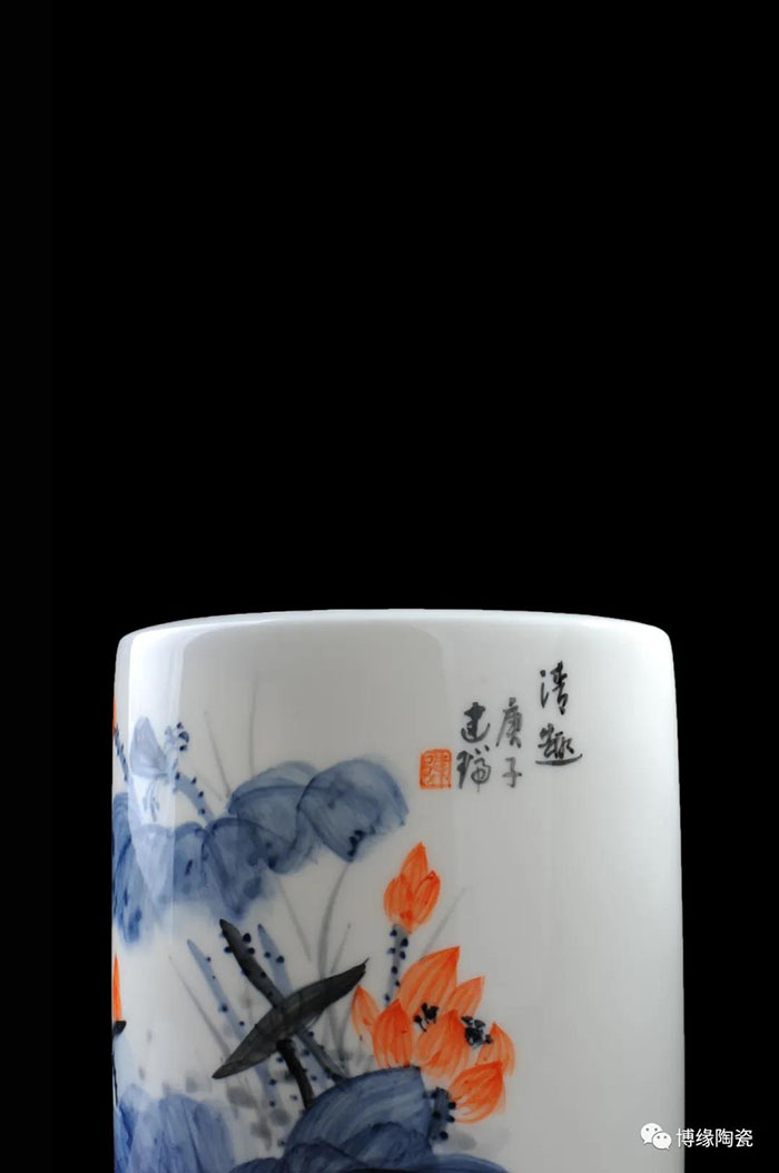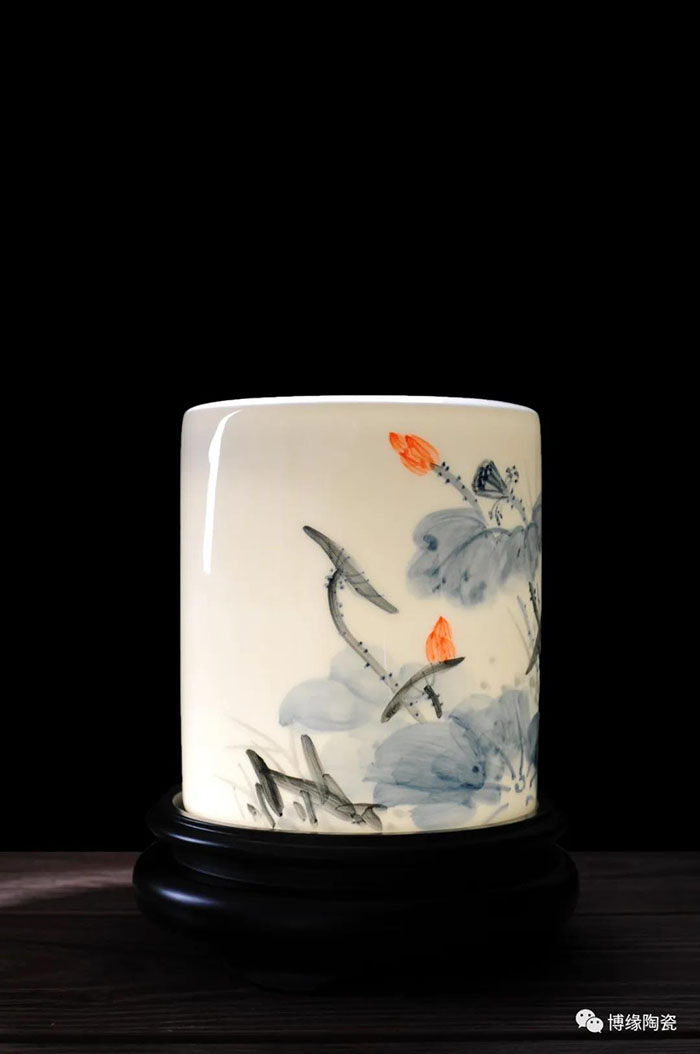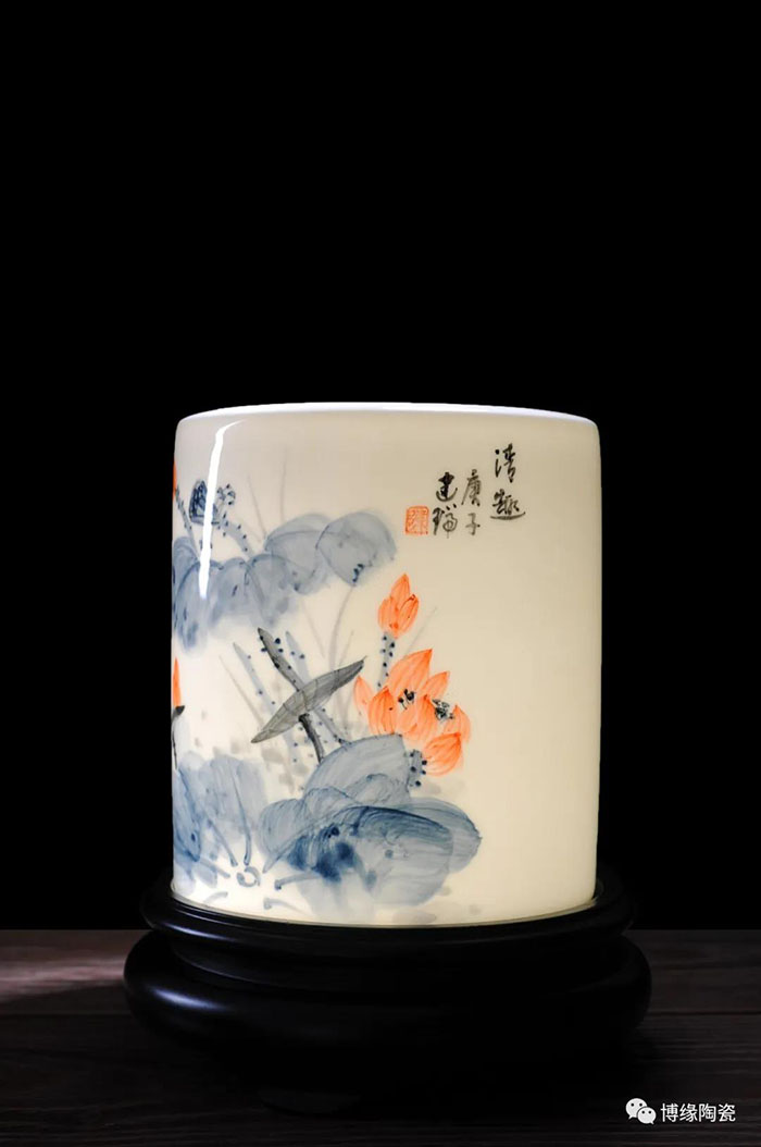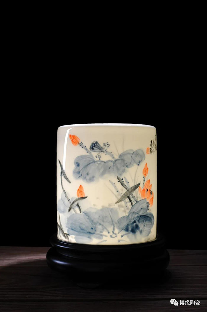 筆筒的制作除了材質(zhì)的不同,繪畫技法也得到了充分的體現(xiàn)。二十世紀初期,江西景德鎮(zhèn)的瓷畫藝人對傳統(tǒng)粉彩畫法加以改造,用粉彩原料在瓷器上繪制中國畫,形成了以“珠山八友”為代表的瓷繪名家流派