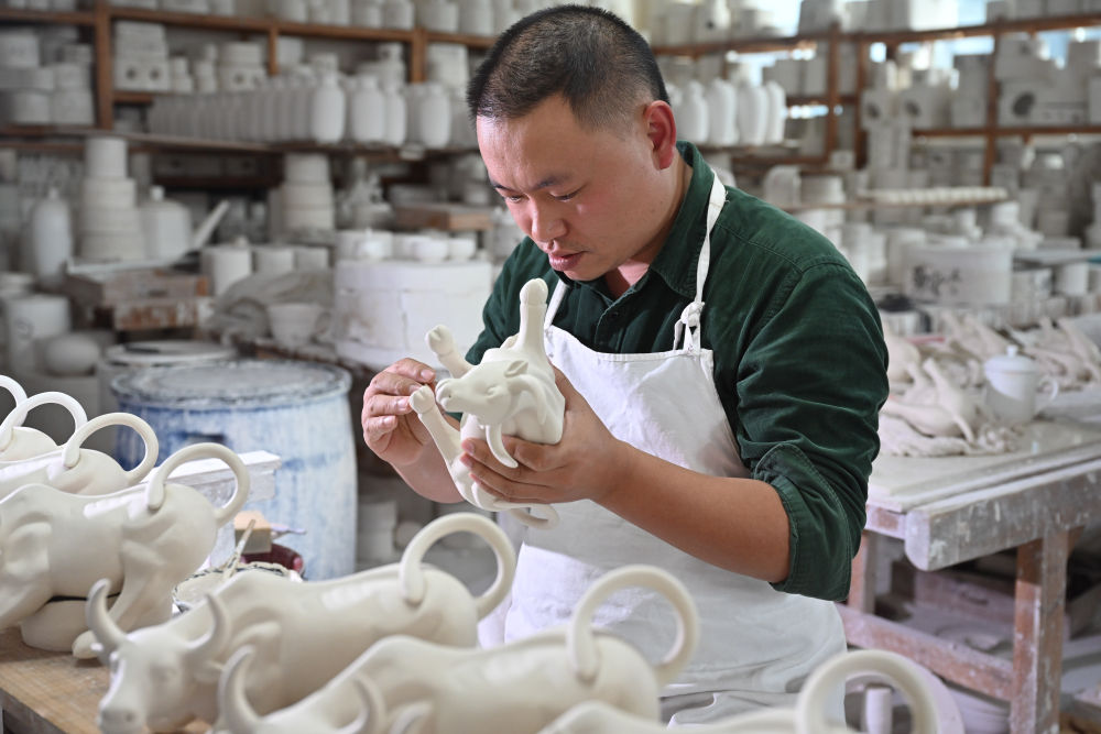 10月21日,在福建省泉州市德化縣順美陶瓷廠,工人制作出口歐美的陶瓷工藝品。