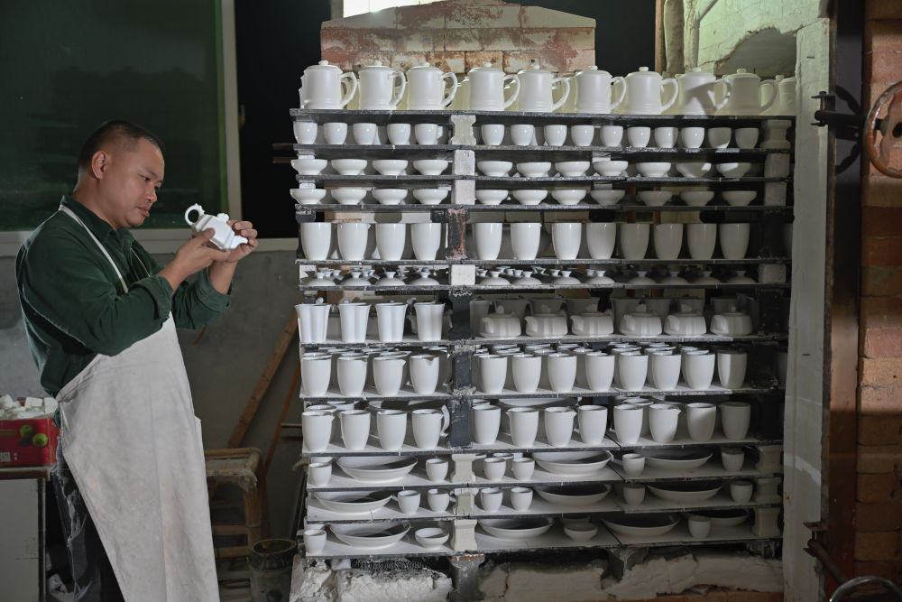 10月20日,徐金寶打開一窯剛剛燒好的白瓷茶具準(zhǔn)備自然降溫。