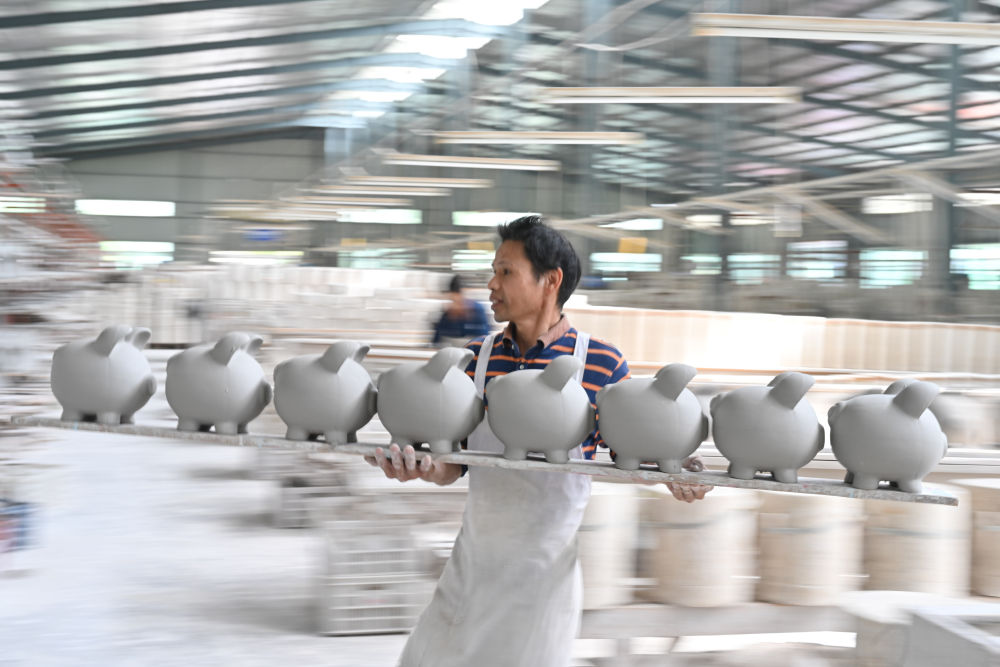 10月21日,在福建省泉州市德化縣順美陶瓷廠,工人制作出口歐美的陶瓷存錢罐。