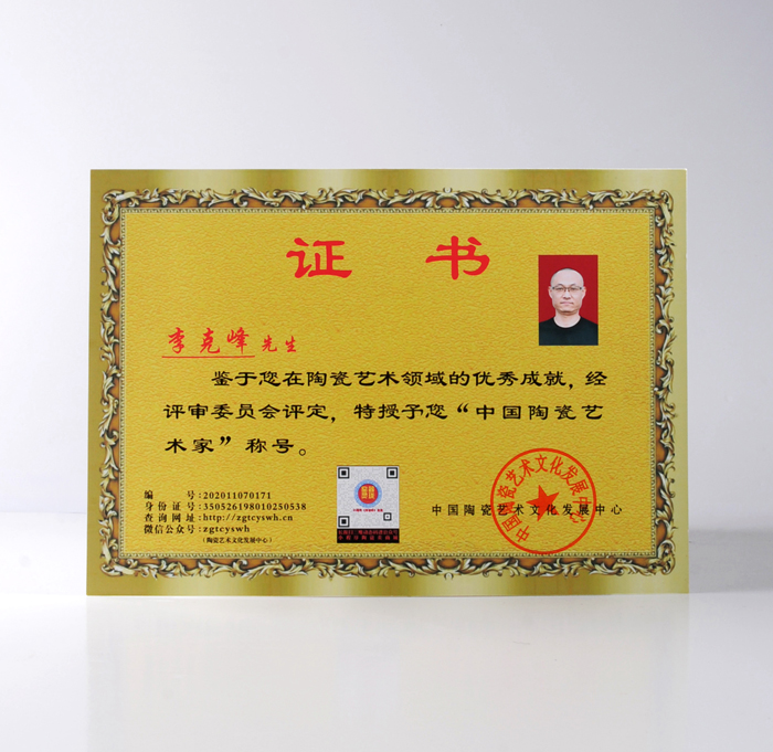 李克峰從事陶瓷創(chuàng)作10多年,主要作品有鎏金、鎏銀茶具,茶壺、紫砂等。作品多次獲得國內(nèi)各評比大賽金獎,2020年獲評“中國陶瓷藝術(shù)家”,作品《龍鳳呈祥》榮獲2020年中國國際(北 京)陶瓷藝術(shù)名家精品展作品評比金獎,其作品深受收藏家及有識之士青睞,廣受好評。