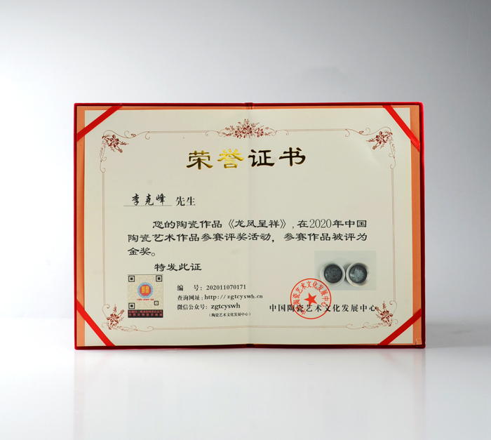 作品《龍鳳呈祥》榮獲2020年中國國際(北 京)陶瓷藝術(shù)名家精品展作品評比金獎