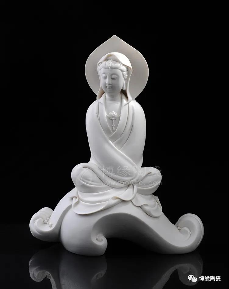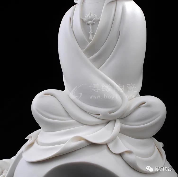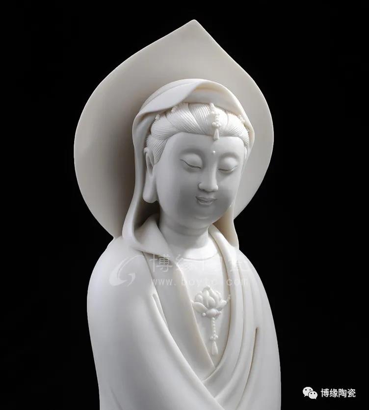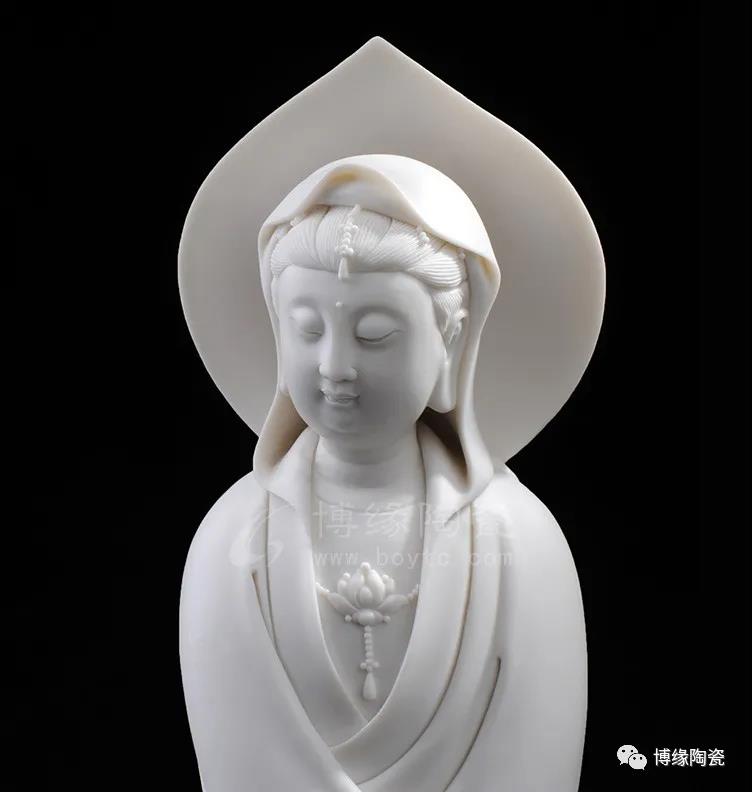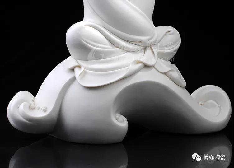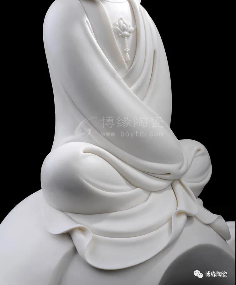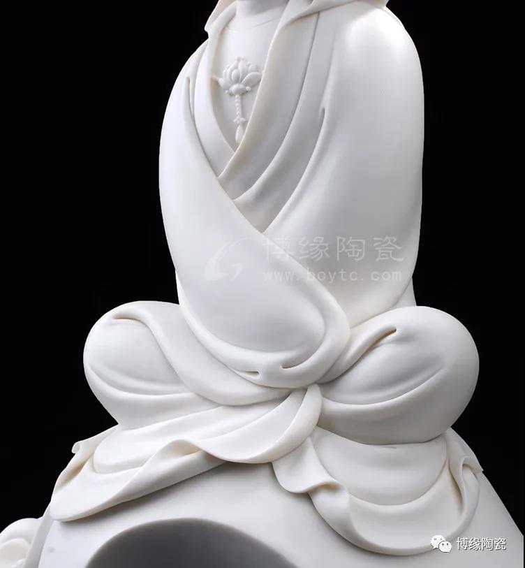 早在明代德化白瓷佛像就名聲在外,一代“瓷圣”何朝宗佛像名作流傳后世,成為世界各大博物館收藏的珍品,更對(duì)佛像雕塑史上產(chǎn)生深遠(yuǎn)的影響,形成“何派”雕塑,其開創(chuàng)的捏、塑、雕、刻、刮、削、接、貼八字技法延用至今。何派觀音雕塑注重于細(xì)節(jié)之美,精益求精,故而十分著意衣紋的刻畫,使線條流暢,翻轉(zhuǎn)自然。觀其佛像,仿佛有春風(fēng)拂面,衣袂飄揚(yáng)的出塵之感。
