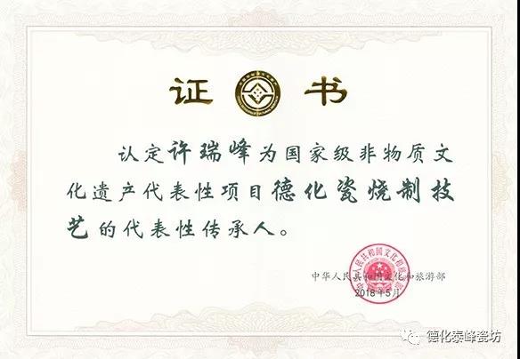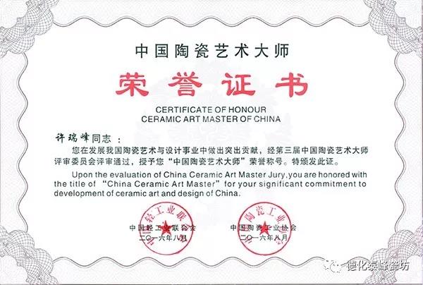 許瑞峰,1969年生于福建省德化縣,是許氏瓷塑第六代傳人,F(xiàn)為中國(guó)陶瓷藝術(shù)大師、非物質(zhì)文化遺產(chǎn)(德化瓷燒制技藝)國(guó)家級(jí)傳承人、高級(jí)工藝美術(shù)師、泉州市優(yōu)秀拔尖人才。福建省商學(xué)院,泉州工藝美術(shù)學(xué)院、泉州市信息工程學(xué)院講座教授、福建省工藝美術(shù)協(xié)會(huì)副會(huì)長(zhǎng)、福建省陶瓷工業(yè)協(xié)會(huì)副會(huì)長(zhǎng)、德化縣政協(xié)常委。