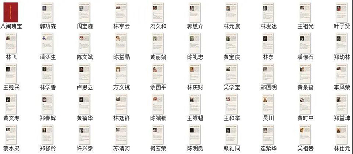 2014年,海峽文化藝術(shù)品保護(hù)基金會出版《八閩瑰寶——八閩中國工藝美術(shù)大師合集》,是最早對全省國大師進(jìn)行系統(tǒng)介紹的專著,是迄今為止最為學(xué)風(fēng)嚴(yán)謹(jǐn)、內(nèi)容權(quán)威者。但由于出版時間較早,未收錄2018年新評選出來的第七屆之十一位國大師。