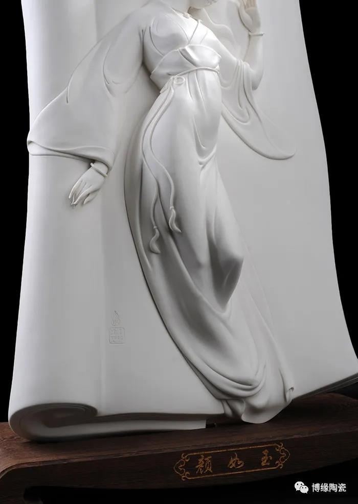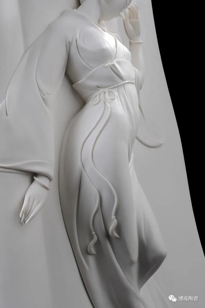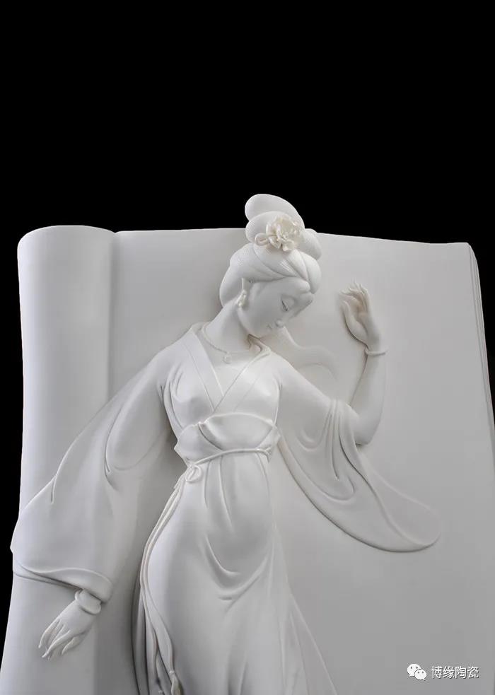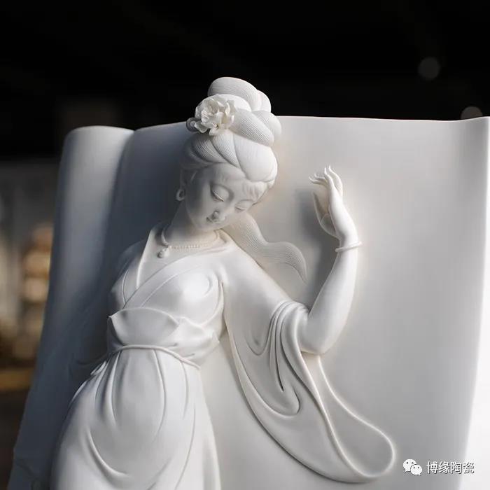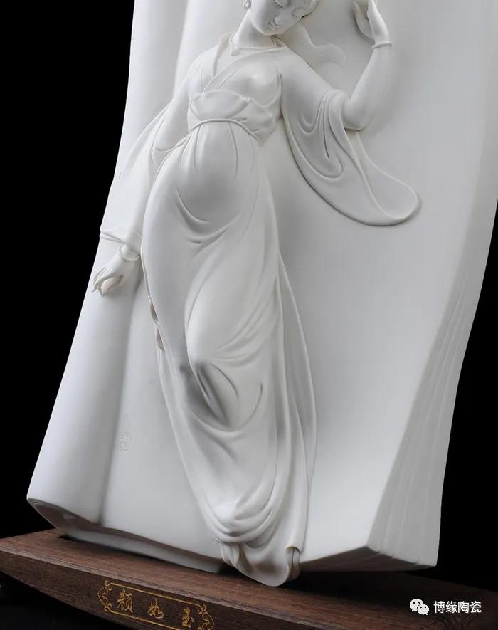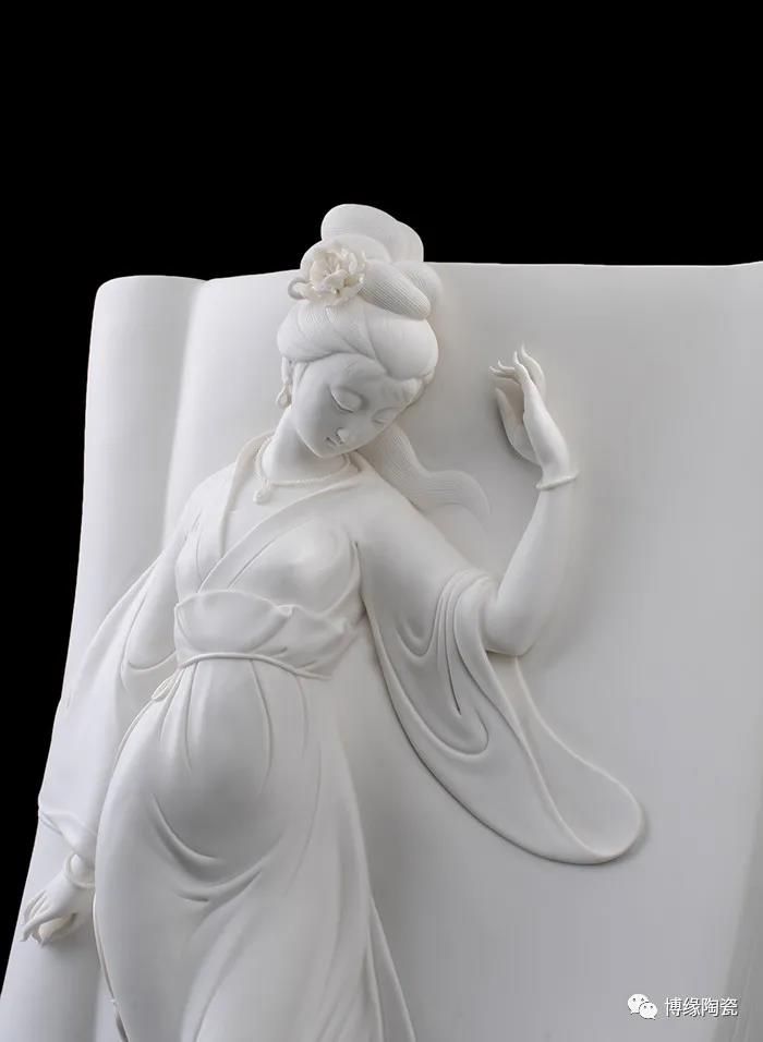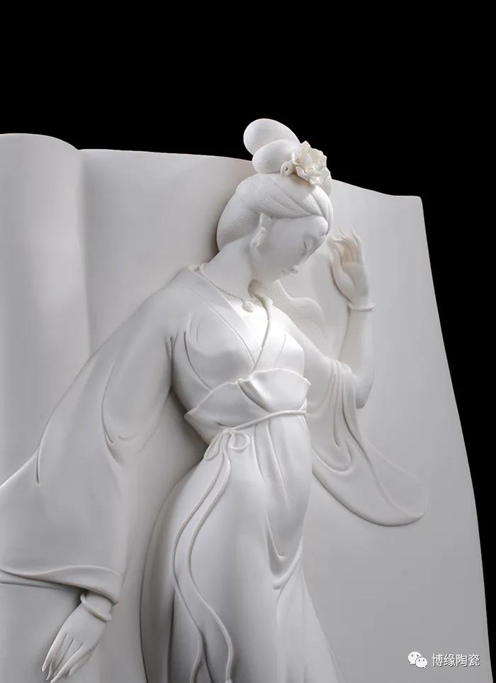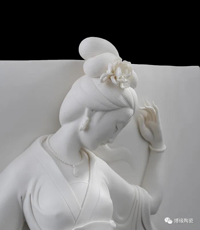 作品沿繼德化白瓷古法堆雕技藝,以白瓷溫潤細(xì)膩為胎質(zhì),表現(xiàn)女子柔美特點(diǎn)。