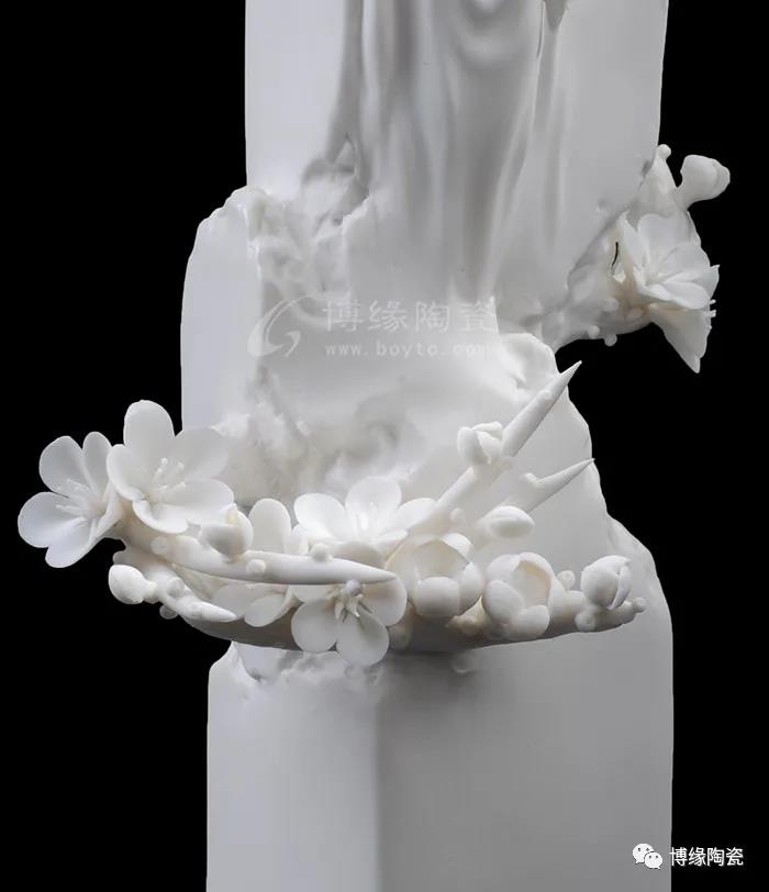 梅”與“眉”同音,故又作“喜上眉梢”,描述人逢喜事,神情洋溢的樣子。作品可見(jiàn)女子坐于巖石梅梢之上,人物端莊,神態(tài)優(yōu)雅,嘴角流露出一絲微笑,整件作品唯美,富有詩(shī)意,手工捏制梅花尤顯精致。