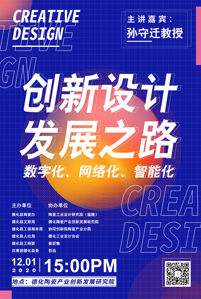 12月1日下午,新一期中國白系列創(chuàng)新沙龍在我院順利舉辦,浙江大學教授、博士生導師、工業(yè)設計領域的重量級專家孫守遷,為德化奉獻了一場精彩的學術分享。