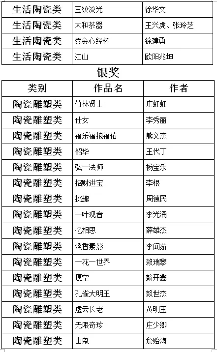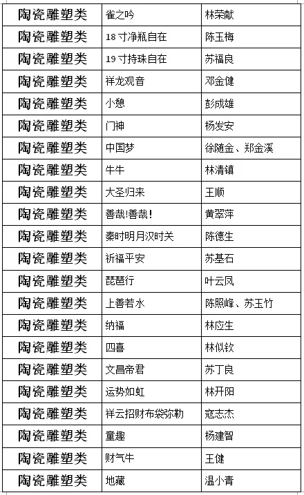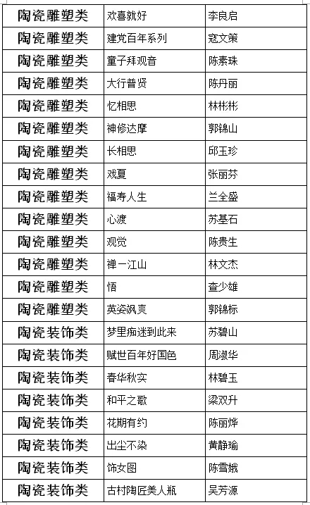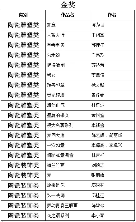 12月6日,福建省工藝美術(shù)學(xué)會“第七屆福建省陶瓷藝術(shù)與設(shè)計創(chuàng)新評比”在泉州工藝美術(shù)職業(yè)學(xué)院評比揭曉。 據(jù)了解,大賽由福建省工藝美術(shù)學(xué)會主辦,福建省工藝美術(shù)學(xué)會陶瓷藝術(shù)專業(yè)委員會承辦,一共有陶瓷雕塑類、陶瓷裝飾類、生活陶瓷類三大評比類別。 本次大賽共評出金銀銅獎項共142件(套),F(xiàn)通告如下: