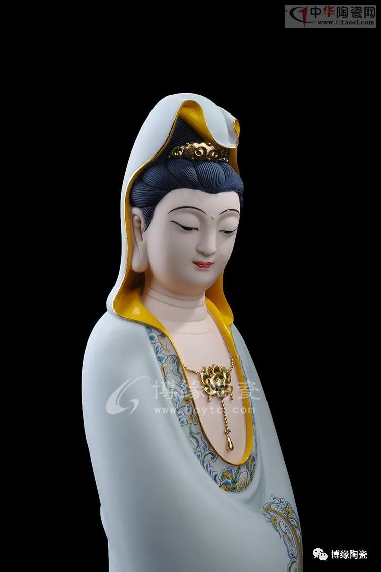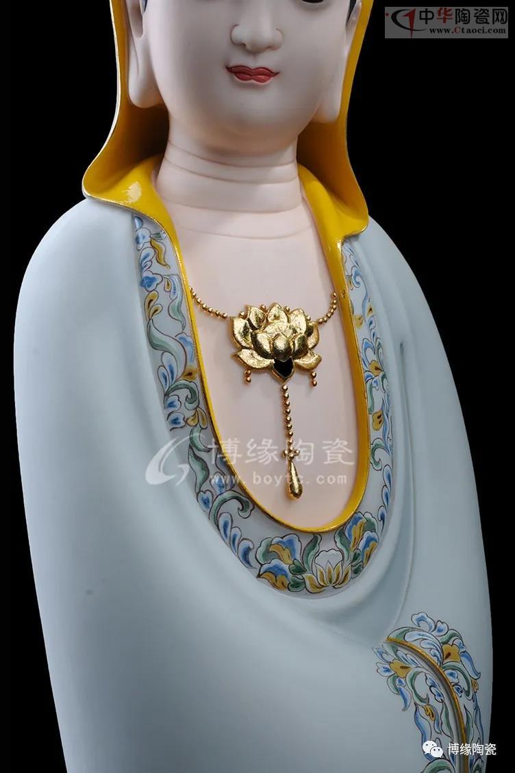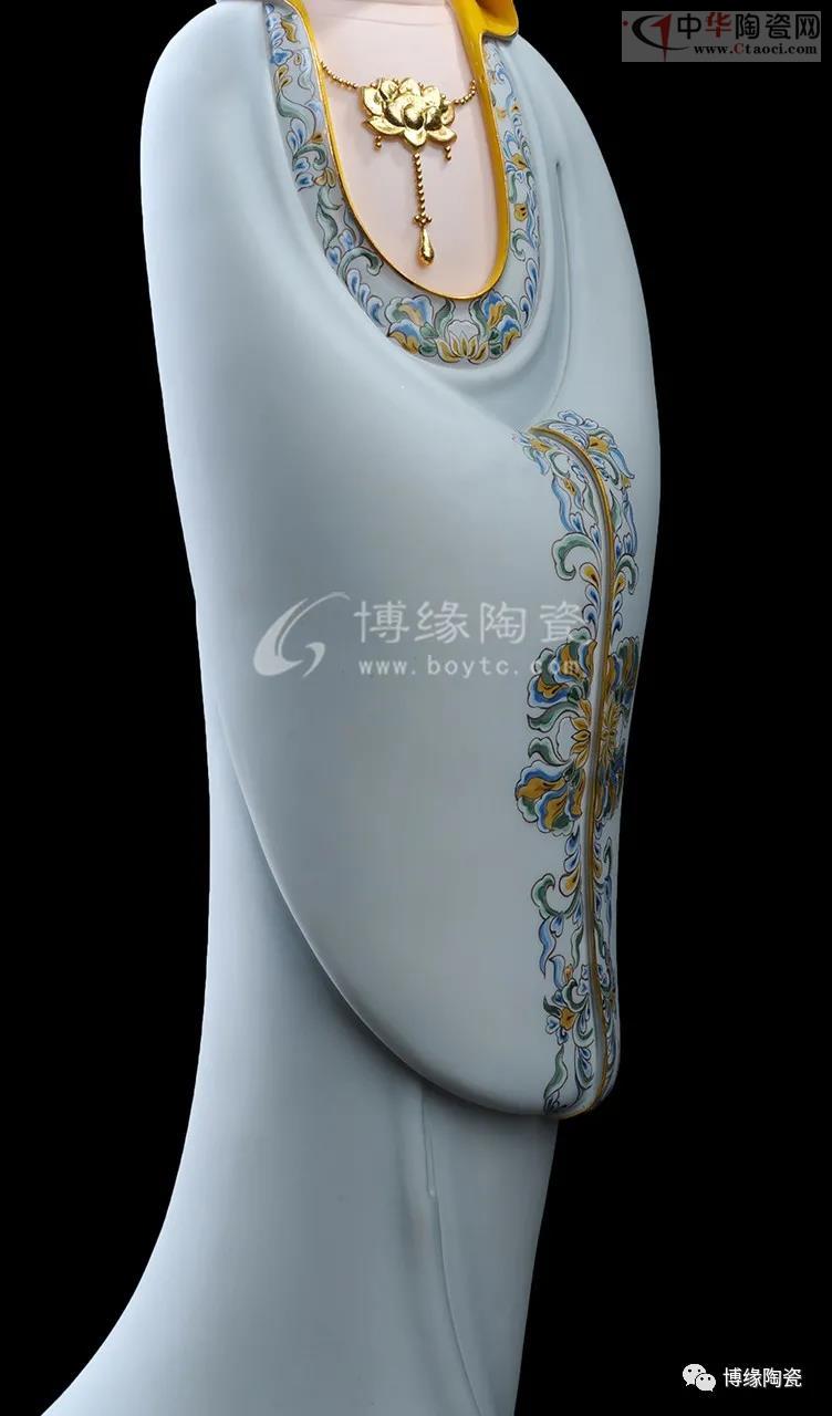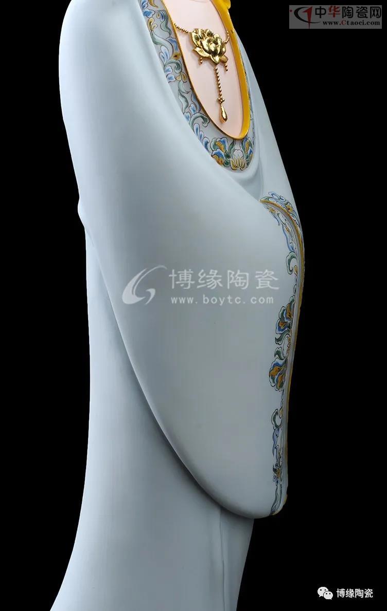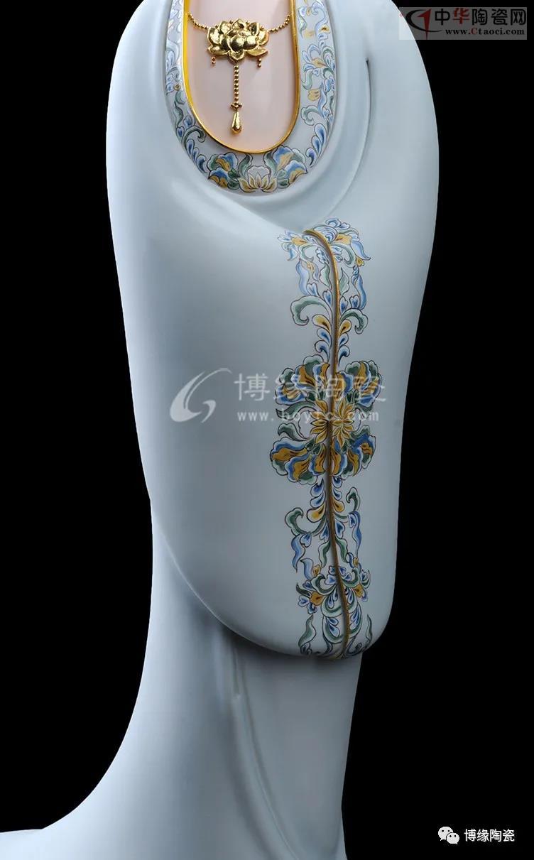 《瓷韻觀音》作品繼承德化“何派”傳統(tǒng)風格加以創(chuàng)新,線條簡潔,類顯S型,作品造型優(yōu)美,觀音面部低首垂目、飽滿豐潤、神情慈祥,似在俯瞰塵世眾生。人物的珠串、花飾手工捏塑而成,細致逼真,作品以德化白瓷為胎體經(jīng)手工繪制,珠串、頭飾手工繪金,使作品更高貴。