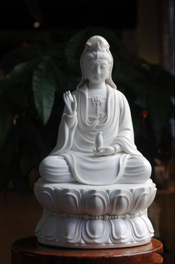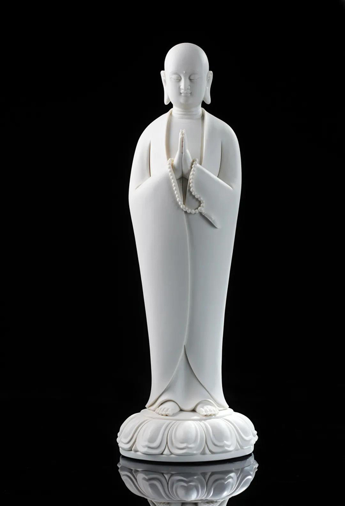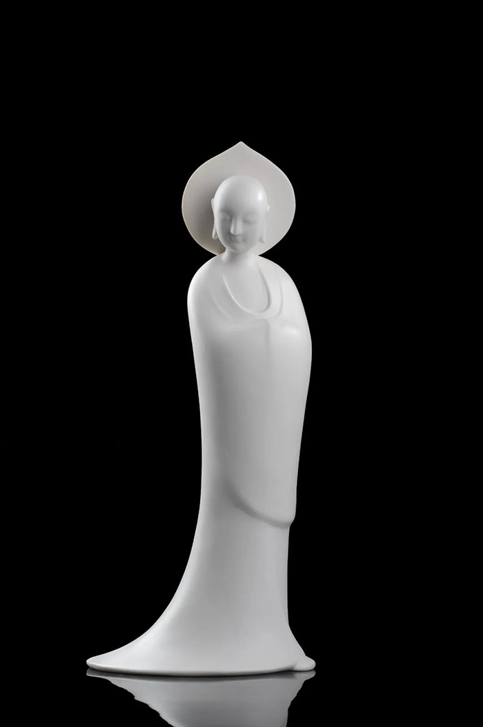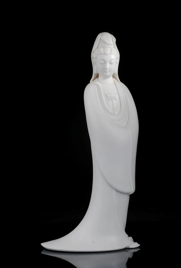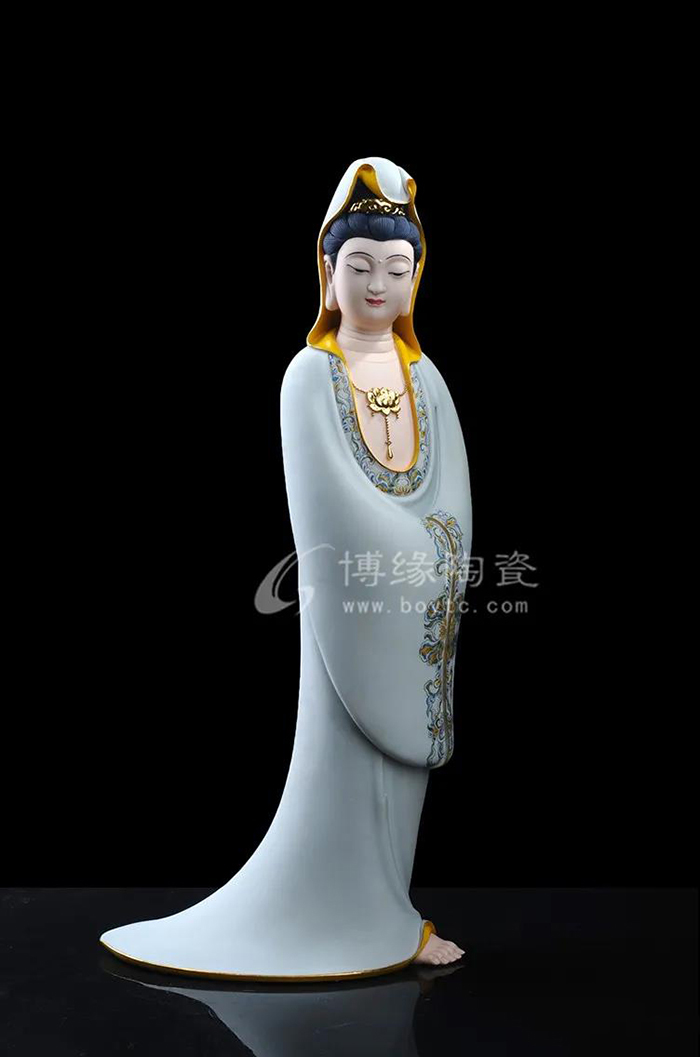 觀音立于蓮花之上,衣紋線條流暢飄逸,雙目微閉,神情安詳,形象傳神。作品精雕巧塑,作品以白瓷為胎骨,手工描金、繪彩,使作品更具層次感,更深動。
