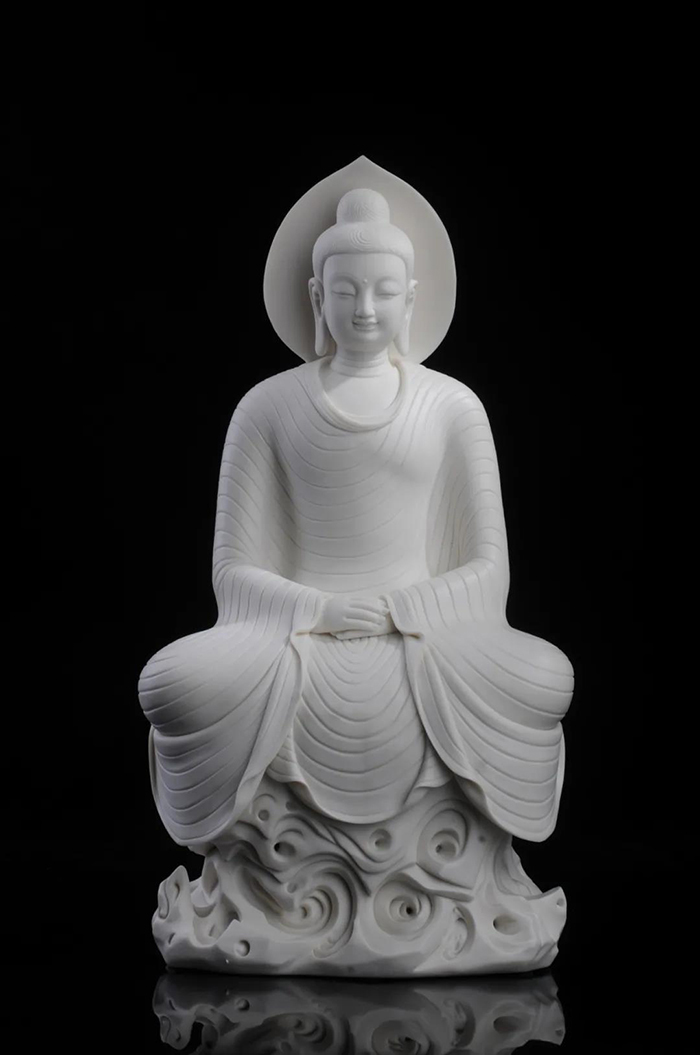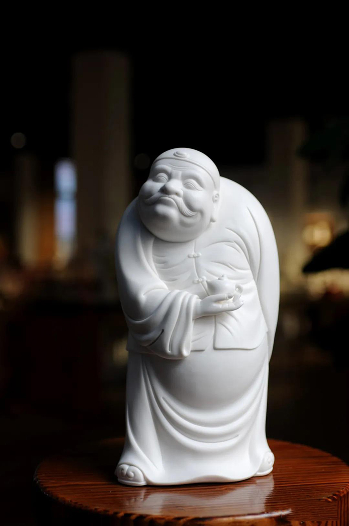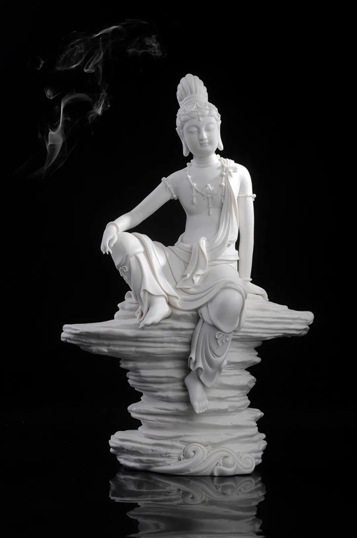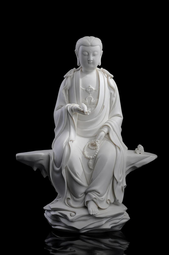 觀音立于蓮花之上,衣紋線條流暢飄逸,雙目微閉,神情安詳,形象傳神。作品精雕巧塑,作品以白瓷為胎骨,手工描金、繪彩,使作品更具層次感,更深動。