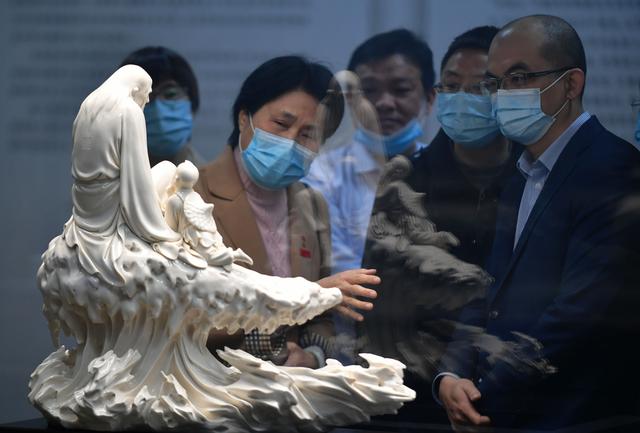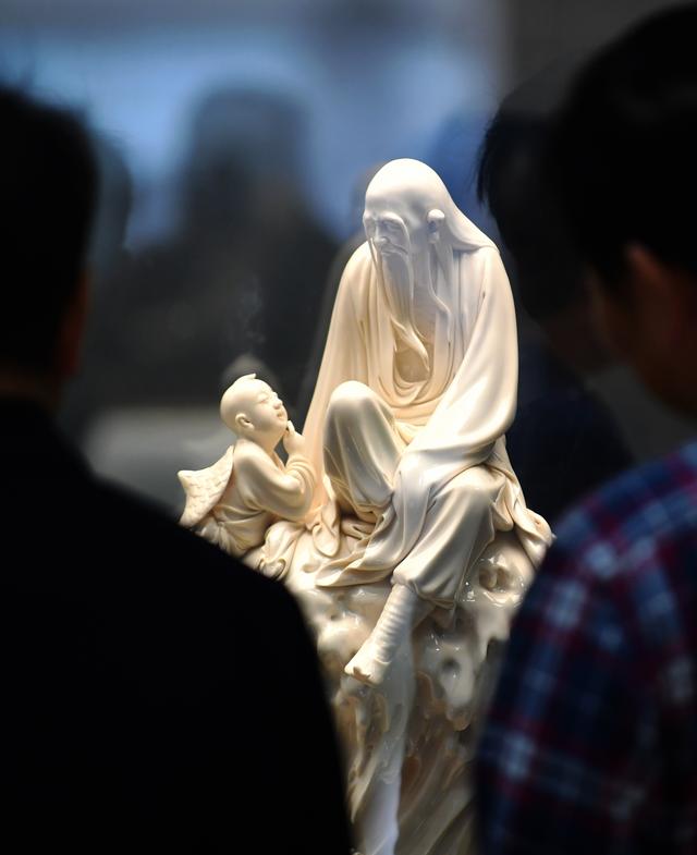 ↑12月16日,觀眾在欣賞首屆德化“中國白”中國傳統(tǒng)陶瓷藝術(shù)雙年展的特等獎(jiǎng)作品《紫氣東來》。