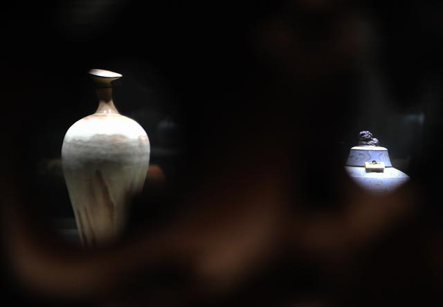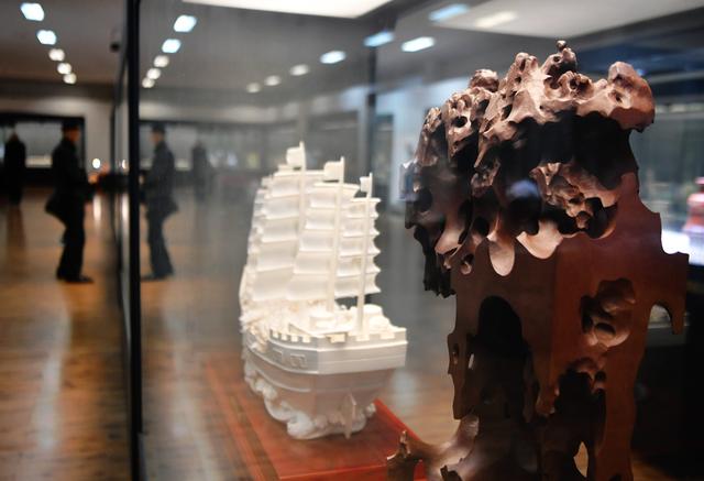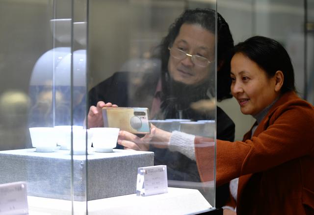 ↑12月16日,兩名觀眾在拍攝陶瓷藝術(shù)精品。