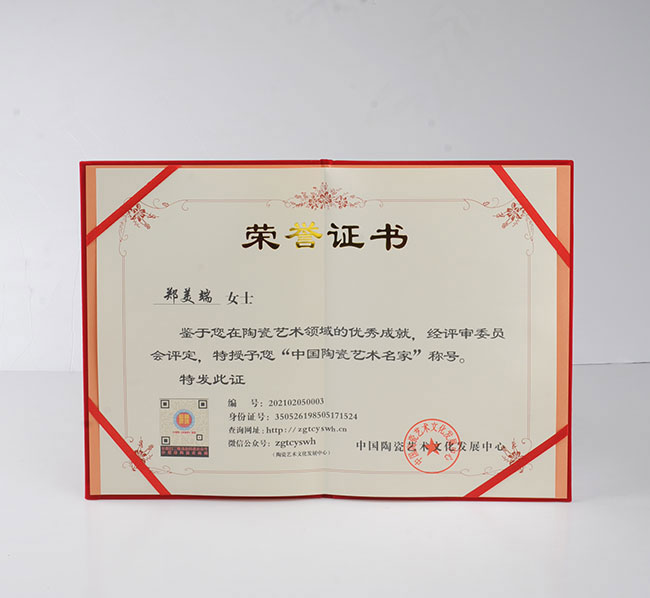 鄭美端,女,漢族,1985年5月出生,大專學(xué)歷,中國陶瓷藝術(shù)名家、中國陶瓷藝術(shù)文化發(fā)展中心會員、福建省德化博雅陶瓷有限公司擔(dān)任藝術(shù)總監(jiān)。