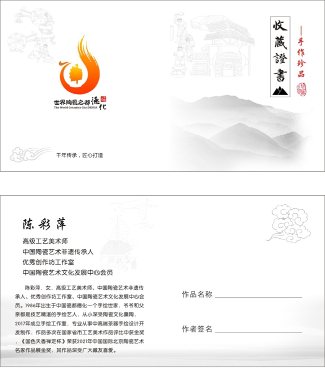 陳彩萍,女,高級工藝美術(shù)師、中國陶瓷藝術(shù)非遺傳承人、優(yōu)秀創(chuàng)作坊工作室、中國陶瓷藝術(shù)文化發(fā)展中心會員。1986年出生于中國瓷都德化一個(gè)手繪世家, 爺爺和父親都是技藝精湛的手繪藝人,從小深受陶瓷文化熏陶,2017年成立手繪工作室,專業(yè)從事中高端茶器手繪設(shè)計(jì)開發(fā)制作,作品多次在國家省市工藝美術(shù)作品評比中獲金獎(jiǎng)《國色天香禪定杯》榮獲2021年中國國際北京陶瓷藝術(shù)名家作品展金獎(jiǎng),其作品深受廣大藏友喜愛。