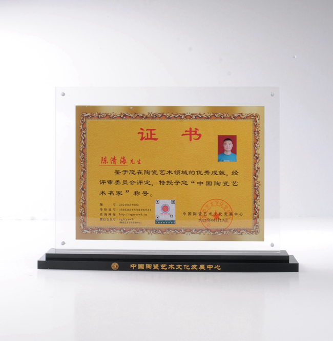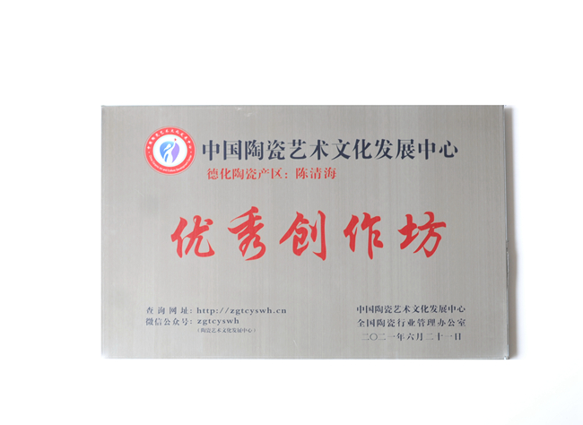 陳清海從小深受瓷都德化陶瓷文化熏陶,耳濡目染,后師從王大山,10多年專注陶瓷雕塑,鎏金鎏銀、窯變七彩孔雀建盞。1996年起進(jìn)入冠福陶瓷開始從事陶瓷設(shè)計生產(chǎn),2014年創(chuàng)辦福建省德化縣宏強(qiáng)陶瓷有限公司,專注于陶瓷鎏金鎏銀杯、窯變七彩孔雀建盞研究、設(shè)計、生產(chǎn)。其所創(chuàng)建盞、鎏金鎏銀杯等作品深受廣大客商喜愛,多件作品榮獲各比評比金獎,作品《琺瑯彩將軍鎏金杯》榮獲2021年中國(北京)陶瓷藝術(shù)家作品評比金獎,2021年被中國陶瓷藝術(shù)文化發(fā)展中心評選為“中國陶瓷藝術(shù)名家”,同時其工作室被評選為“優(yōu)秀創(chuàng)作坊”。